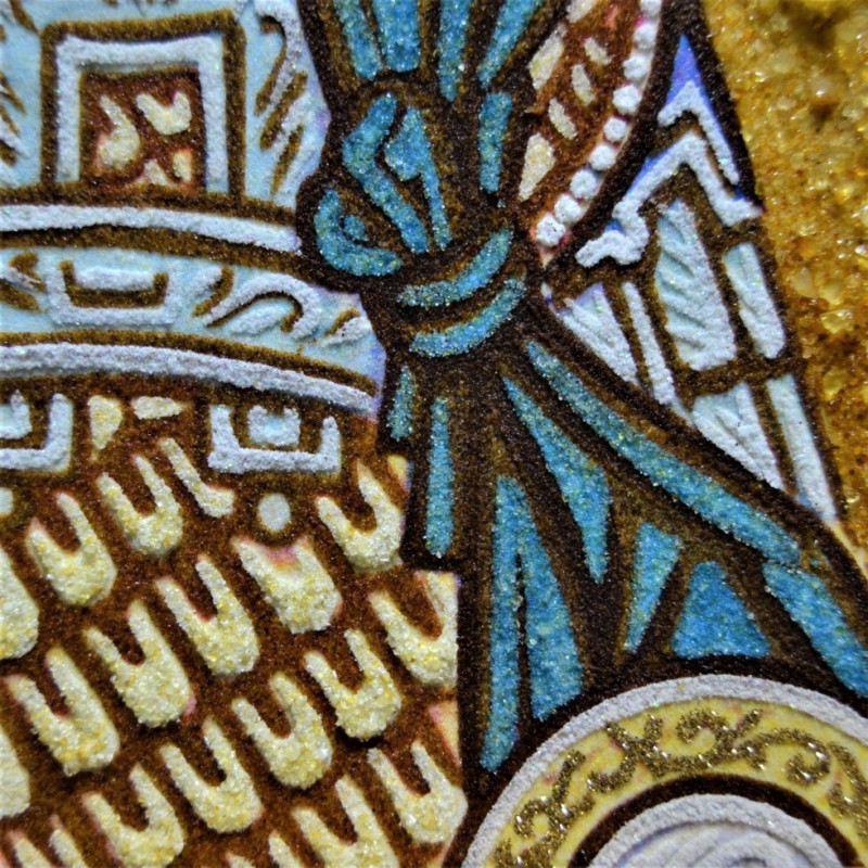 Дана іменна ікона виконана професійним майстром насипною і набірною технікою із застосуванням бурштинової крихти і дорогоцінних каменів різних розмірів. Янтарна ікона оформлена в багет на ваш вибір, а також за бажанням, ікону можливо здійснити під склом.