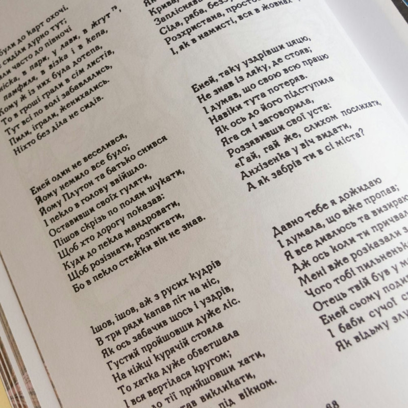 "Енеїда" – перша друкована книга українською народною мовою, три перші частини якої було видано ще у 1798 році. Видано, попри заборону на друк книг українською мовою 1720 року. Історична, літературна пам’ятка української культури, з якої фактично розпочато відлік української літературної мови, безперечно, заслуговує саме такого видання! Адже осмислення «Енеїди» як початку нової української літератури стало фактом культурної самосвідомості, тоді як сама поема була і залишається в центрі читацької, літературознавчої та культурологічної уваги. Важливо й те, що «Енеїда» Котляревського стала першим друкованим твором, який було написано «народною» мовою. На сторінках поеми автору вдалося передати яскравий етнічний колорит, життя і побут українського народу, його звичаї, традиції спілкування, мову, життєві деталі та особливості світосприйняття.