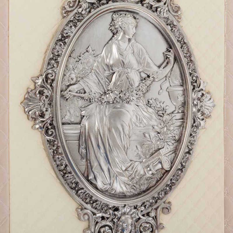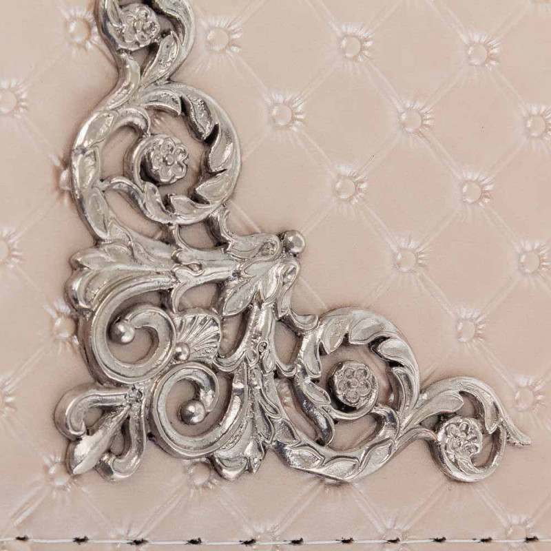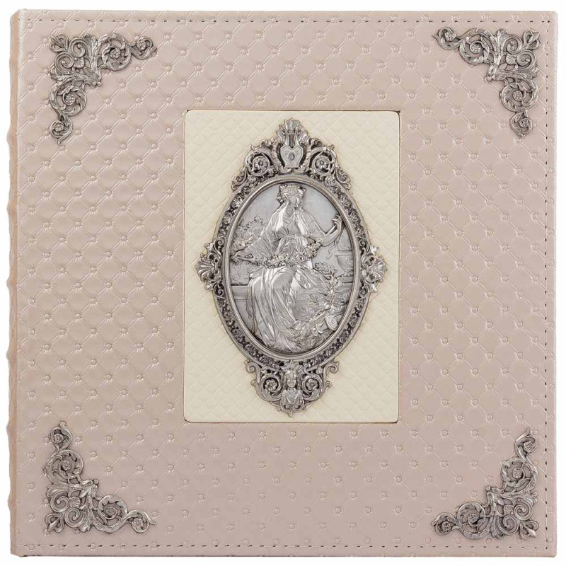 Центром оформления является металлизированный декор: рельефная накладка и аккуратные углы из меди, полностью покрытые серебром. Они напоминают старинные рамки для портретов, символизируя связь поколений и трепетное отношение к семейной истории. Мягкое серебряное сияние делает акцент на важности каждого снимка.