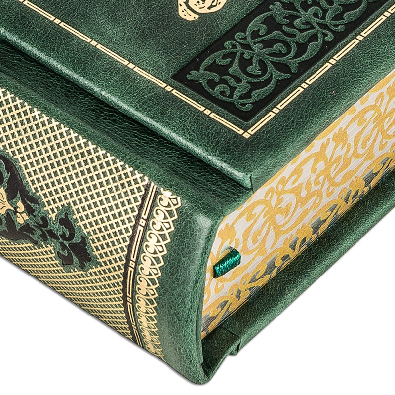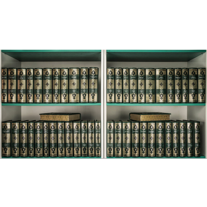 Составной переплет «Брадель» ручной работы, выполнен из натуральной кожи «Scarlett Green» производства итальянской кожевенной фабрики Carisma». Обложки книг оформлены комбинацией многоуровневого объемного тиснения: глубокого блинтового, рельефного золотого и серебряного, c использованием фольги «Luxor 240». Обрезы книг выполнены в уникальной технике позолоты с нанесением орнамента.