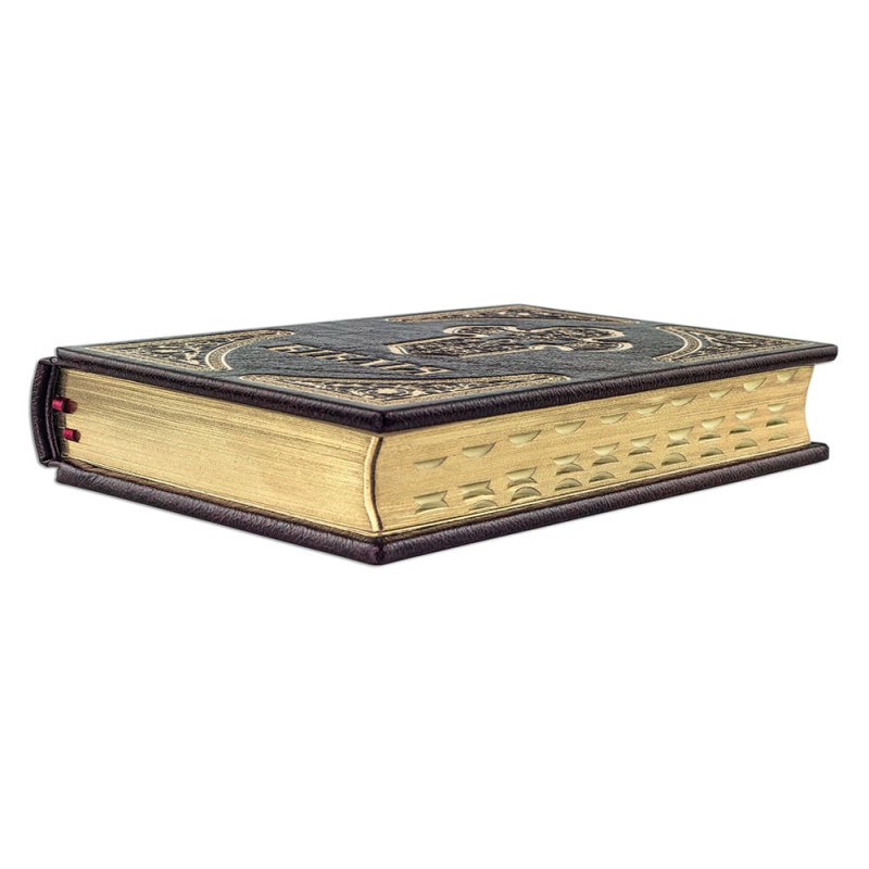 Составной переплет "Брадель", ручной работы, выполнен из натуральной кожи "Marma Rossa" производства итальянской кожевенной фабрики "Carisma". Обложка книги оформлена рельефным золотым тиснением, с использованием фольги "Luxor 240". Обрез книги вручную полирован и позолочен.
