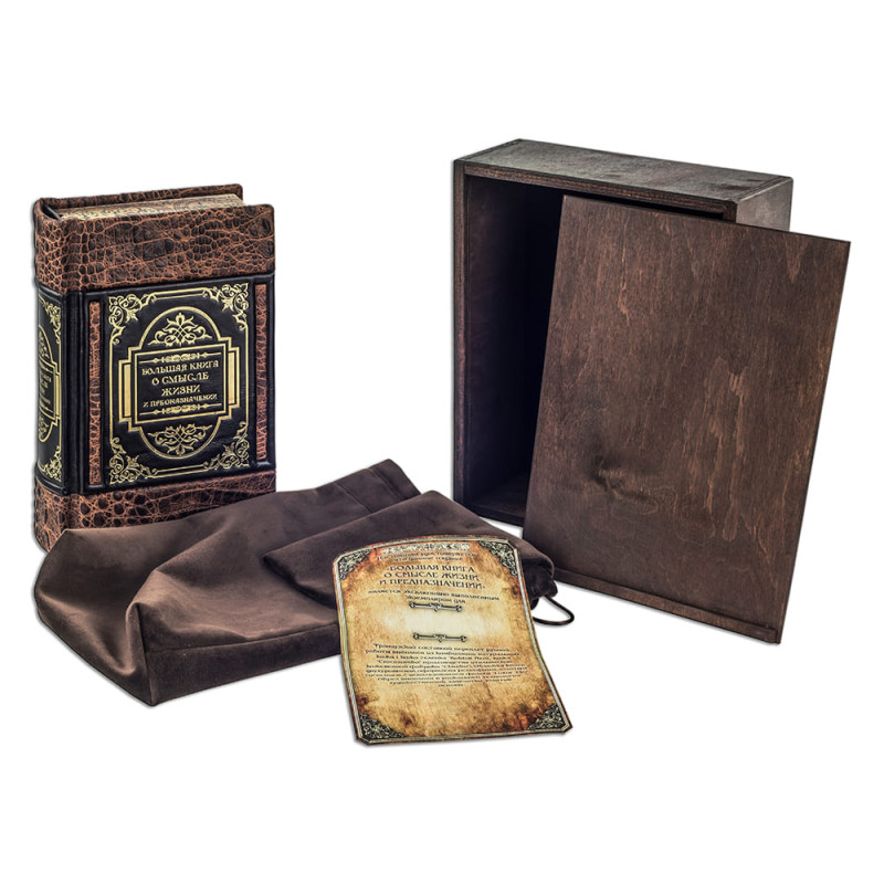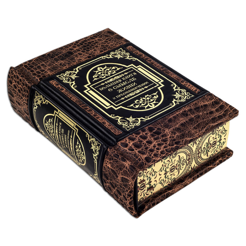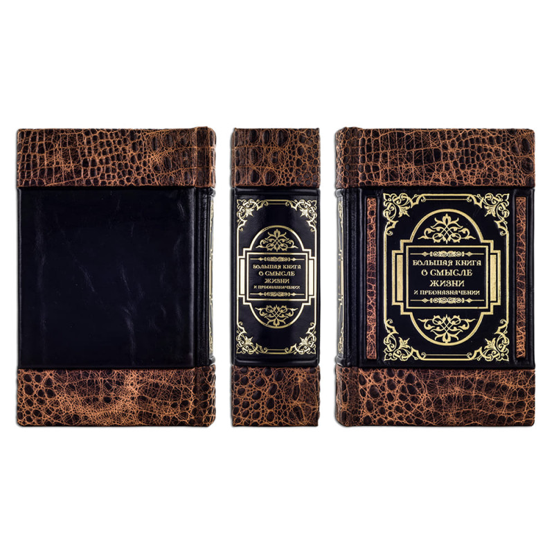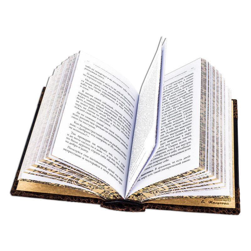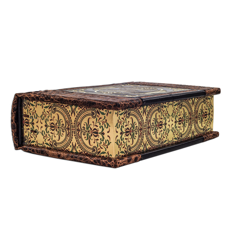 Составной переплет "Брадель", ручной работы, выполнен из комбинации натуральных кож (кожа "Robbat blue", кожа "Crocozombo" производства итальянской кожевнной фабрики "Benericetti"). Обложка книги двухуровневая, оформлена рельефным золотым тиснением (использована фольга "Luxor 240"). Обрез книги оформлен в уникальной технике художественной запечатки золотой основы.