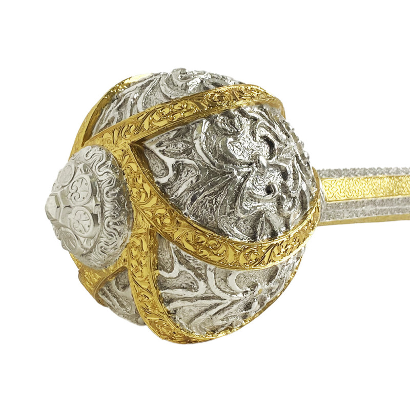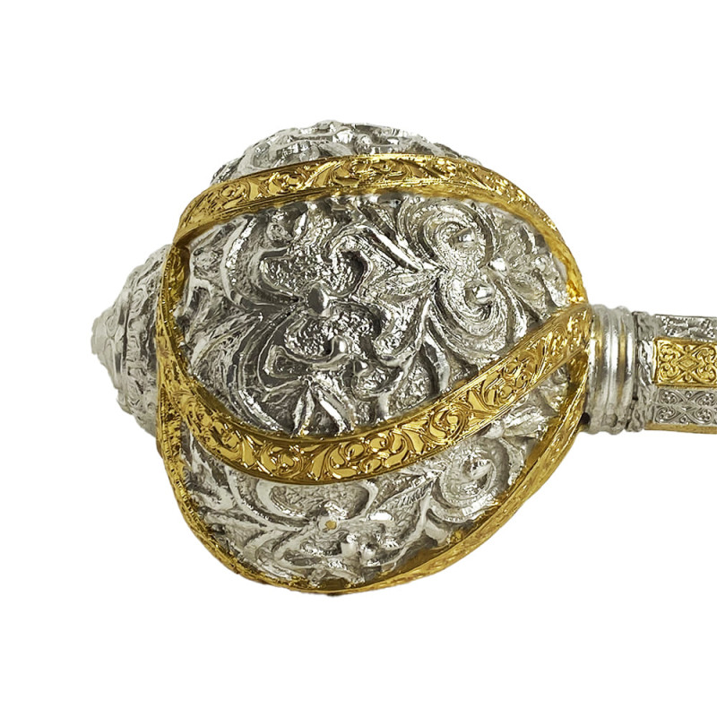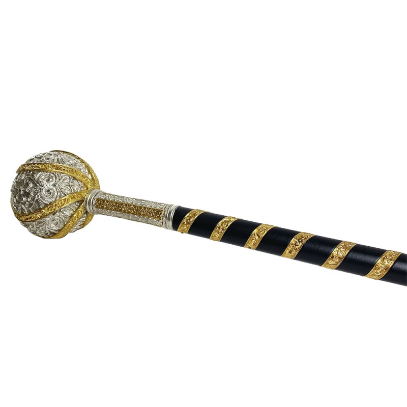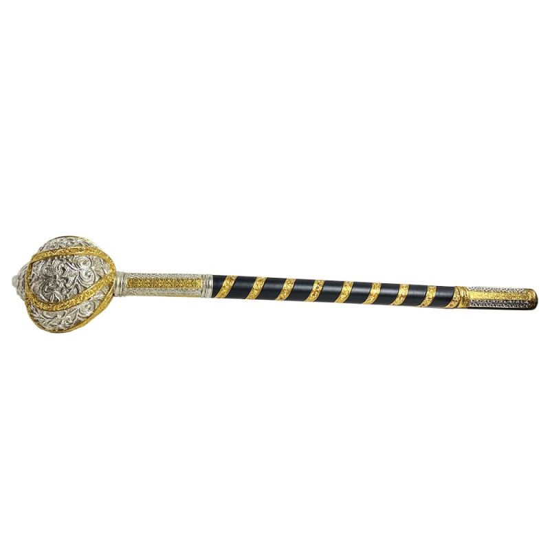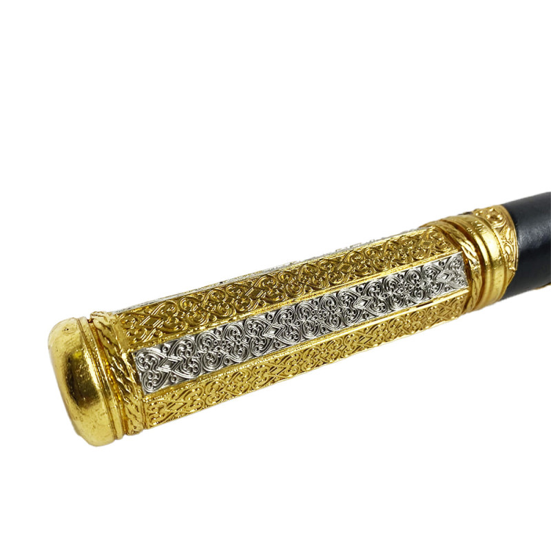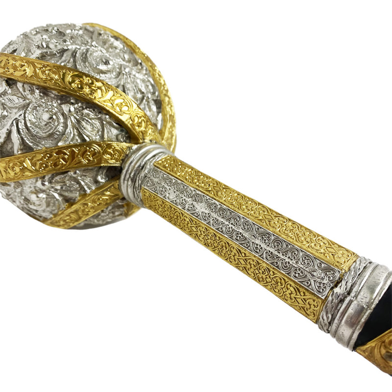 Подарочная булава вылита из ювелирного сплава, покрыта золотом и серебром методом гальваники, декорирована кожаной вставкой.
