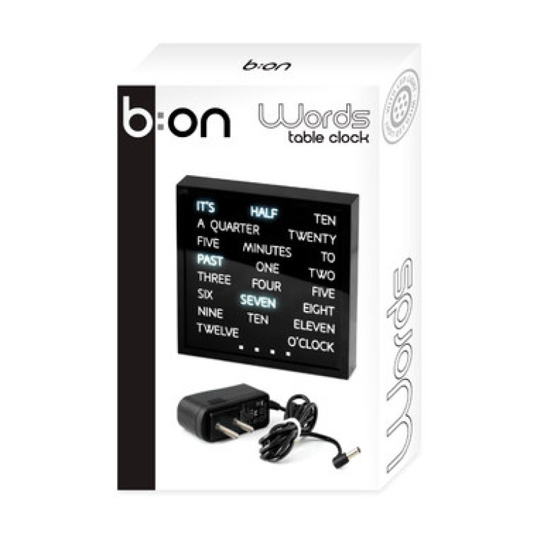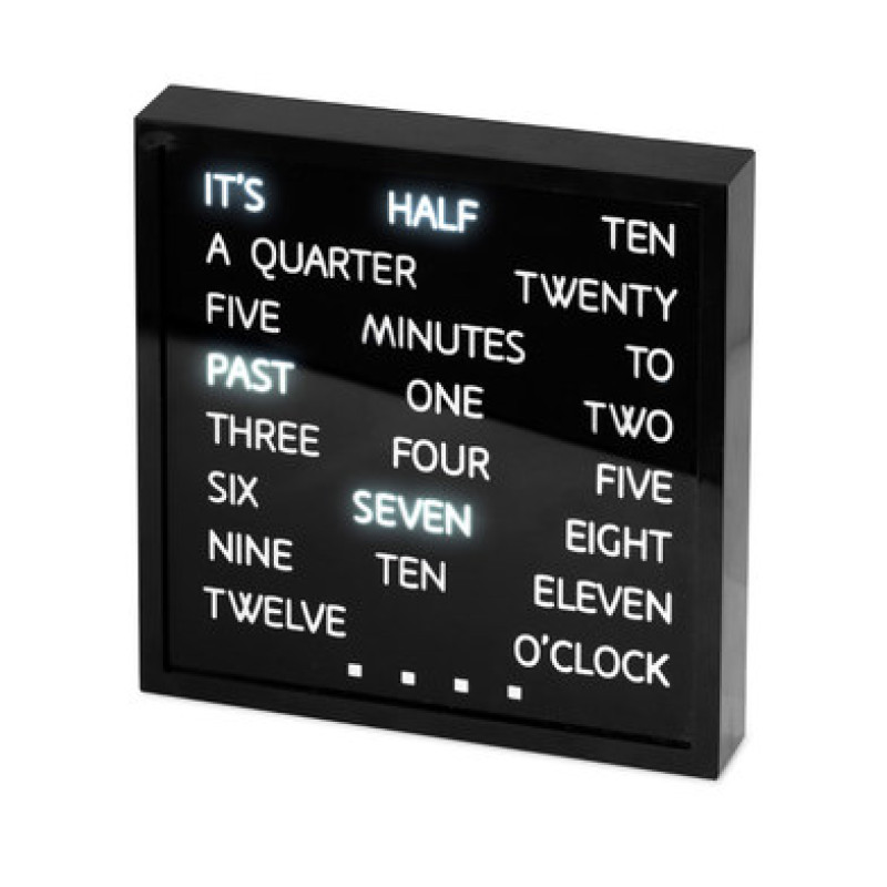 Однако всегда хочется, чтобы изделие было не просто красивым, а и с элементами чего-то необычного. Дизайнеры компании Balvi это учли. Они создали часы Words настольные. С первого взгляда не каждый поймет предназначение такого атрибута. Ведь стандартных цифр на нем нет. Они написаны словами, белым шрифтом и размещены по всей поверхности черного атрибута строками. Форма этого изделия квадратная. Стороны по 16,5 см. Сделано оно из пластика. Электронный механизм невероятно зрелищный, уникальный. Он точно не останется незамеченным, при этом порадует точностью. Желая узнать реальное время, необходимо к информации буквами прибавлять значения точек внизу циферблата, чтобы осведомиться о минутах. Поначалу привыкнуть к такому способу ориентации кажется сложно. Но вскоре проходит адаптация, и аксессуар просто влюбляет в себя.