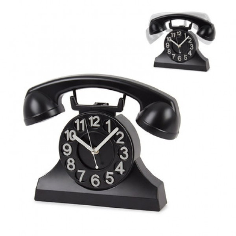 Работает на батарейках АА (3 штуки), стильного черного цвета с белыми стрелками и арабскими цифрами. Основная фишка модного аксессуара - его форма. Он выполнен в виде старого стационарного телефона, который использовался в середине прошлого века, с трубкой на металлических рычагах. Такой дизайн изделия, безусловно, понравится любителям стиля ретро. Понравится и компактность изделия: он узкий, подставка устойчивая. Модный аксессуар будет верно служить своему владельцу много лет.