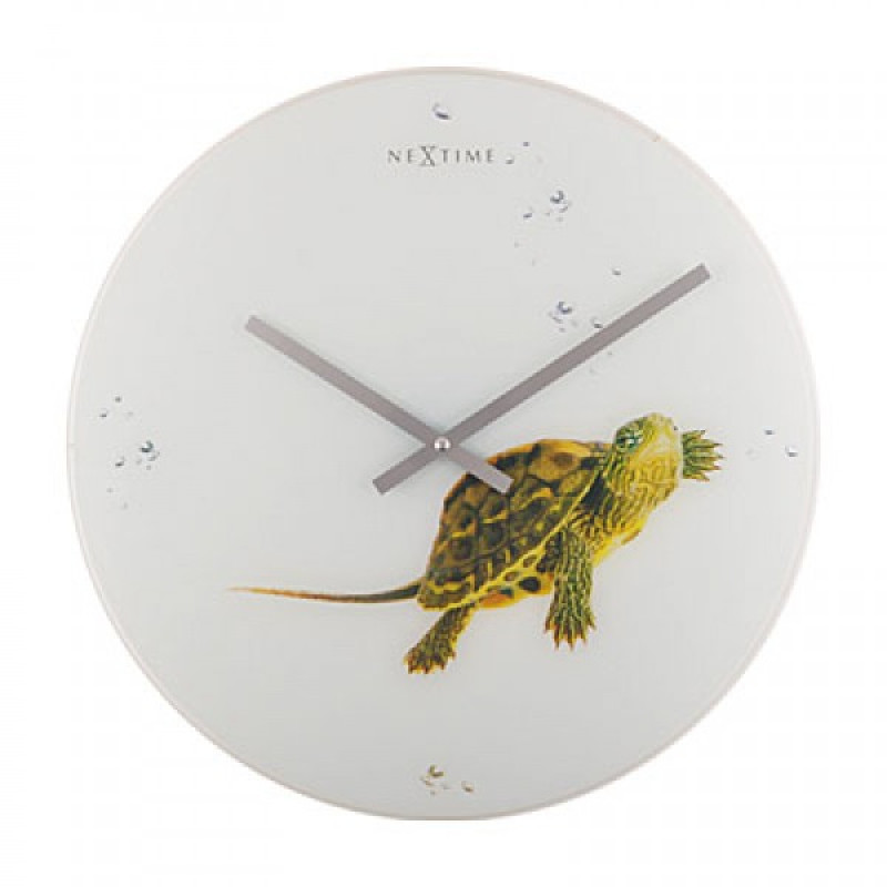 На 43-сантиметровом стеклянном циферблате изображена черепаха, которая будто плывет сквозь морскую глубину, медленно, задумчиво, но очень уверенно. Такой рисунок успокаивает и расслабляет. Он отлично подойдет как для офиса, так и для домашнего декора. Этому способствует отсутствие любых обозначений времени на циферблате. Так часы выглядят благороднее и становятся похожими на картину.