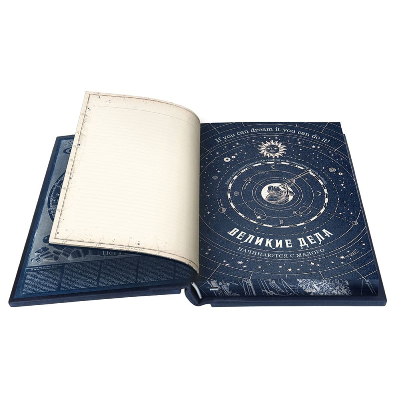 Кремовая бумага оформлена под старинную звездную карту, а на обрезе книжных страниц размещены фрагменты "Атласа звездного неба", его автор - известный астроном XVII века Ян Гевелий.