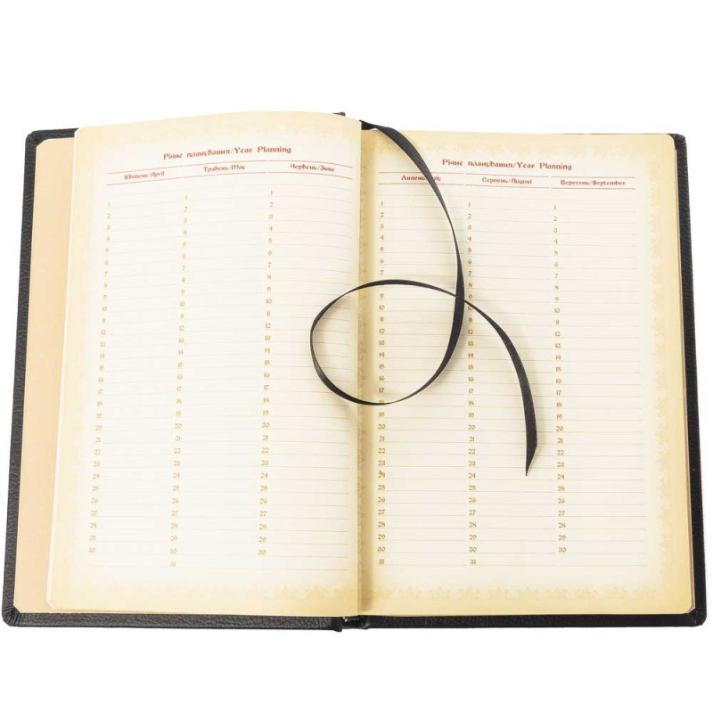Данный ежедневник оформлен в переплет из натуральной высококачественной кожи ручной работы. Лицевая сторона блокнота украшена красивой медной накладкой, которая покрыта позолотой, а также, по всему периметру, ежедневник украшен золотым тиснением. На ежедневнике имеются декорации художественной ювелирной эмалью. С боковой части ежедневника есть золотой срез.
