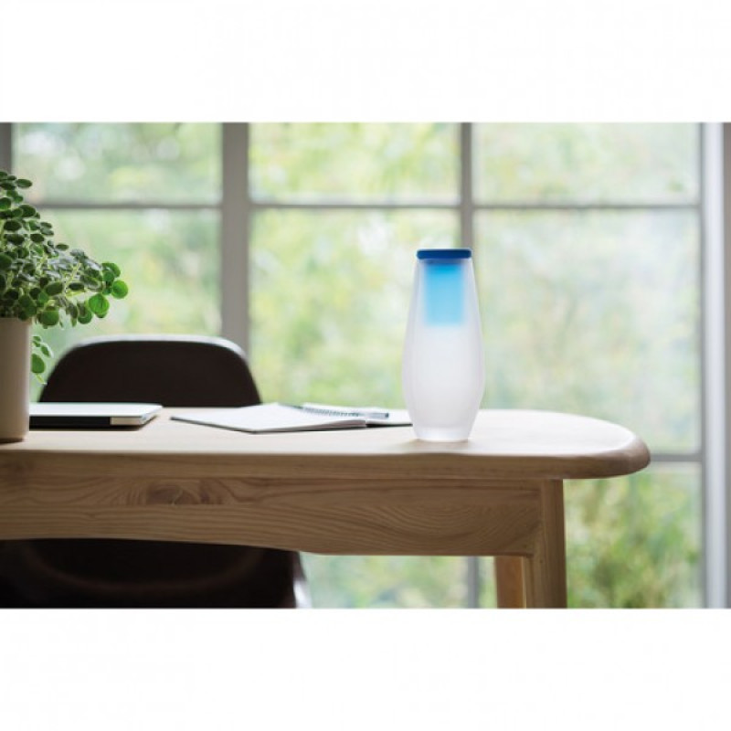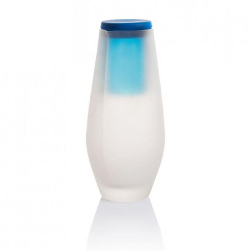 Особенностью его является эргономика. Изготовленный из цветного стекла стакан служит крышкой, надежно защищая содержимое от любого действия извне. Кстати, производитель предлагает этот элемент атрибута в двух вариантах – зеленый и синий. Так что выбрать можно с учетом преимуществ будущего хозяина. Дизайн изделия зарегистрирован. Оно будет отлично смотреться на рабочем столе в деловой атмосфере, а также в интерьере кухни дома. Можно брать такую удобную емкость с собой в автомобиль, в путешествие.