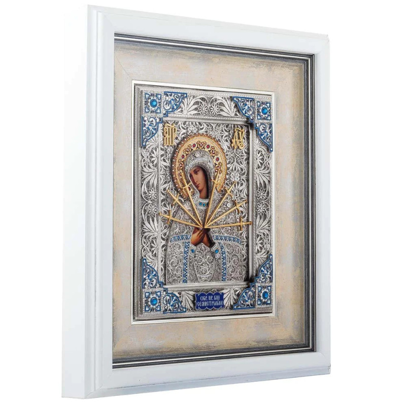 Икона "Божья Матерь Семистрельная" из серебра с эмалью в белой раме