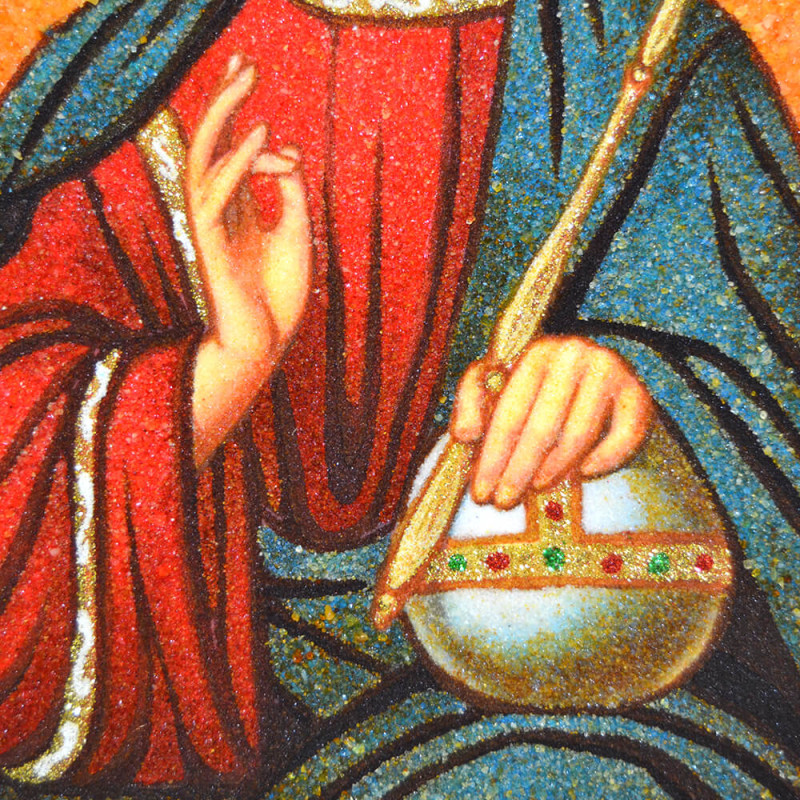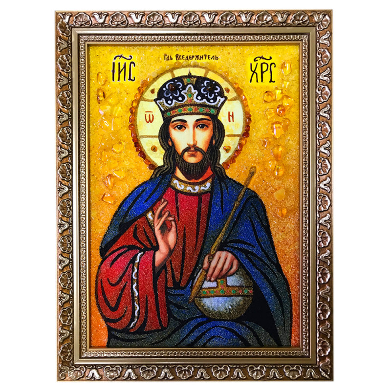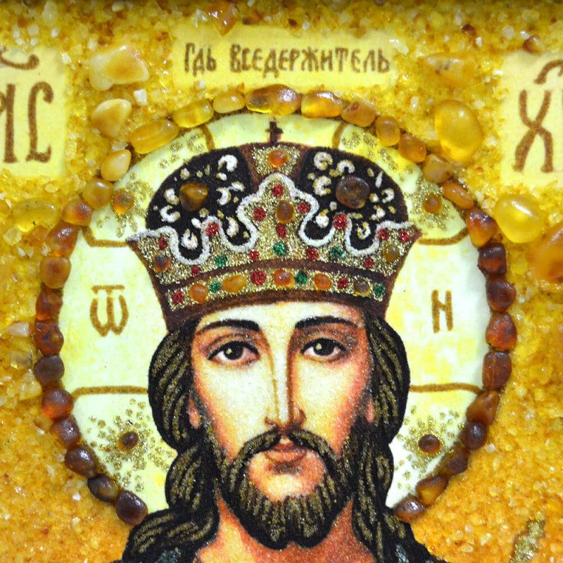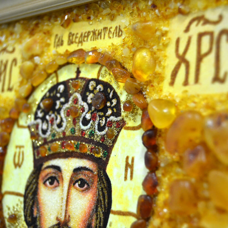 Икона "Спаситель Господь Вседержитель" выполнена как насыпной, так и наборной техникой нанесения камня. Для этого мастер использовал янтарную крошку и большие камни разных размеров. Икона красива и является произведением искусства.