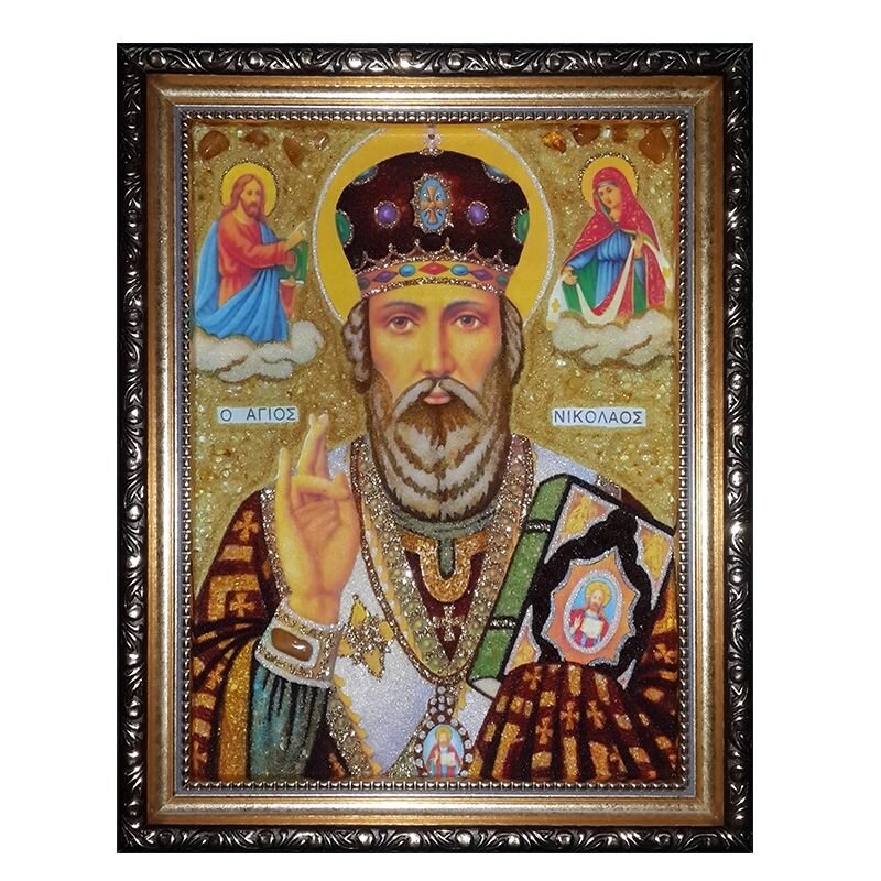 Данная именная икона выполнена профессиональным мастером насыпной и наборной техникой с применением янтарной крошки и драгоценных камней разных размеров. Янтарная икона оформлена в багет на ваш выбор, а также по желанию, икону возможно осуществить под стеклом.