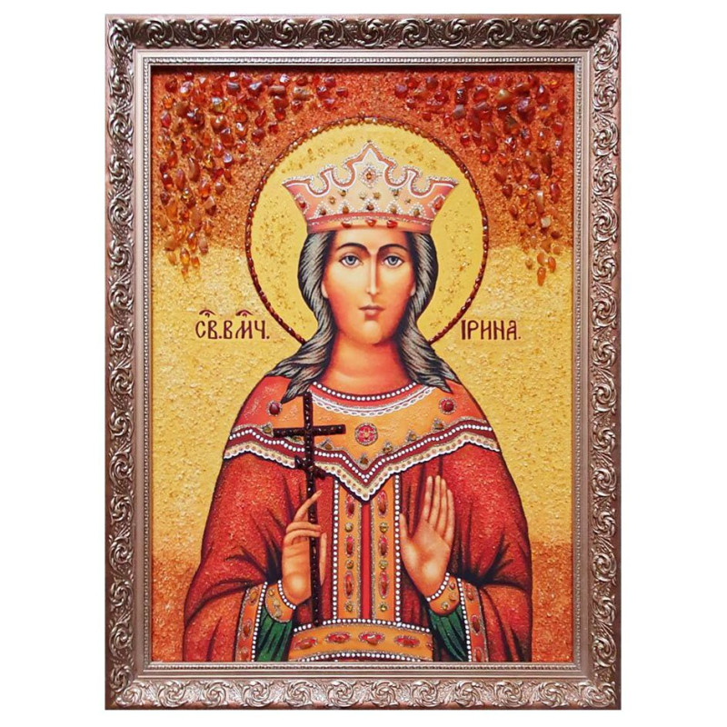 Святая великомученица Ирина была одной из первых мучениц за Христа и жила в Римской империи в первом веке. Святая Ирина до крещения жила с родителями и носила имя Пенелопа. Родители были язычниками, как большинство населения Римской империи. Её отец Ликиний был правителем области в Македонии. Он построил для дочери роскошный дворец, где она проживала, окруженная сверстницами и слугами со своей воспитательницей Карией. Каждый день к Пенелопе приходил её наставник Апелиан, который обучал ее наукам. Он был христианином. Апелиан рассказал девице о Иисусе Христе и стал ее наставником в христианских добродетелях и в христианском учении. Однажды к Пенелопе в окно прилетели одна за другой три птицы - ворон со змеей, орел с венком и голубь с масличной веткой. Учитель Апелиан истолковал знамение так: орел - это знамение высоты духа, достигаемой через богомыслие, а принес венок за победу над невидимым врагом, как от Господа награду; голубь означал добродетели девицы - целомудрие, кротость и смирение, а принес масличную ветвь - благодать Божию, которую в Крещении получает христианин; ворон принес змею в знак того, что дьявол ополчится на неё и будет ей доставлять гонения, скорби и печали. В конце беседы учитель сказал, что Господь желает обручить ее Себе и что она претерпит за своего Небесного Жениха многие страдания. После этого Пенелопа приняла Крещение от руки ученика святого апостола Павла, апостола Тимофея, отказалась от замужества и была наречена Ириной.