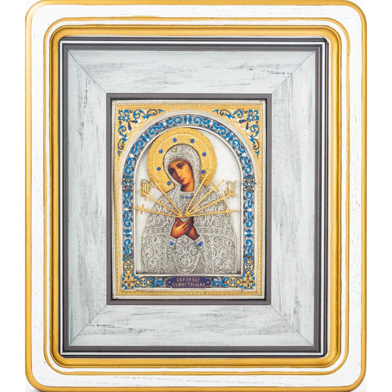 Икона Святая Богородица Семистрельная посеребренная в белой раме