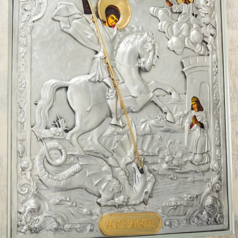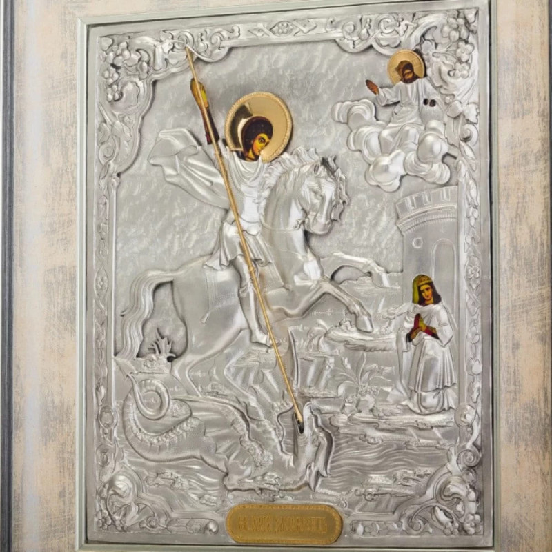 Святой Георгий Победоносец, один из наиболее уважаемых святых в православной и католической традициях, воплощает в себе идеал христианского воина и защитника веры. Его образ символизирует победу добра над злом, мужество и непоколебимость перед испытаниями. Изображение святого Георгия представляет его в рыцарском доспехе, с мечом в руке, готовым противостоять атакам врага. Его главное подвиг — победа над драконом, что символизирует победу христианства над силами тьмы и зла.