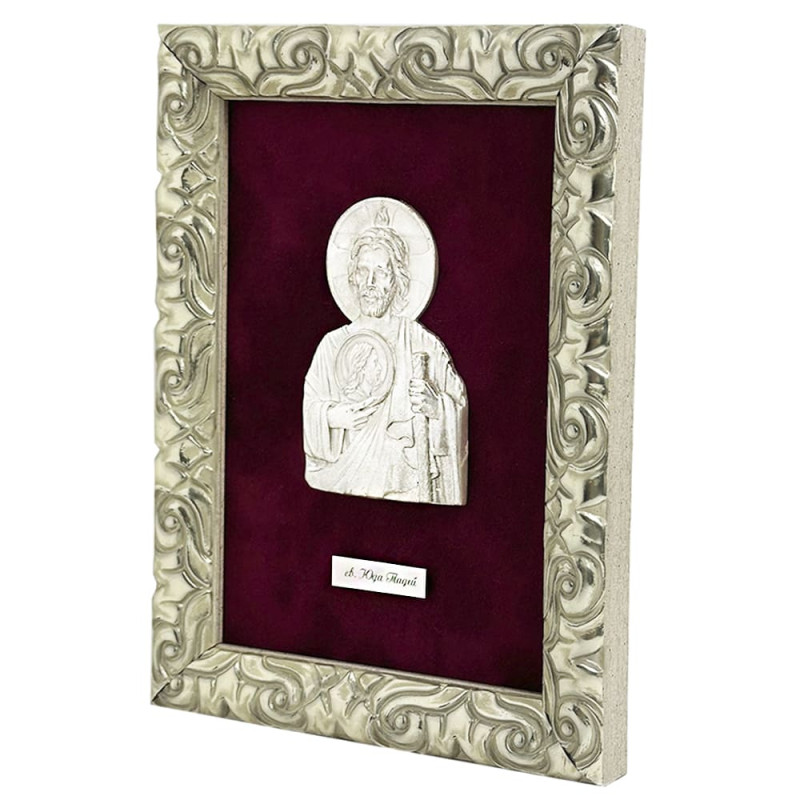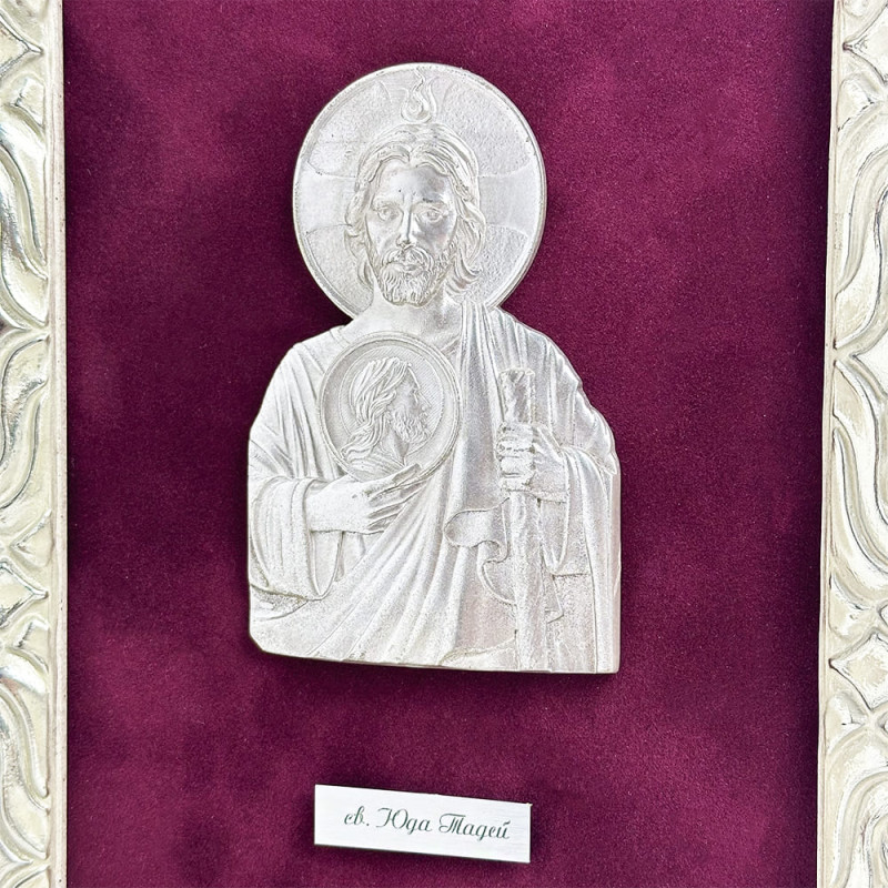 Икона "Юда Тадей" – изящный образец мастерской ручной работы, созданный из керамики, покрытой серебром. Ее благородный вид подчеркивает фон из бардового бархата, придающего изделию глубины и величества. Икона расположена в элегантном багете, гармонично завершающем композицию.