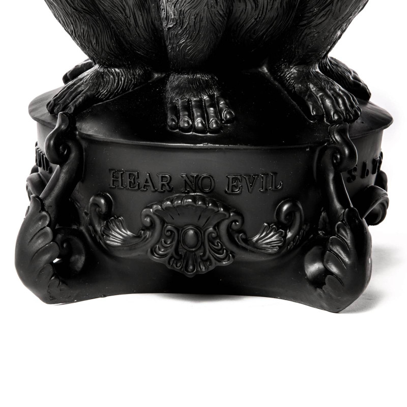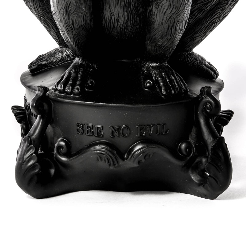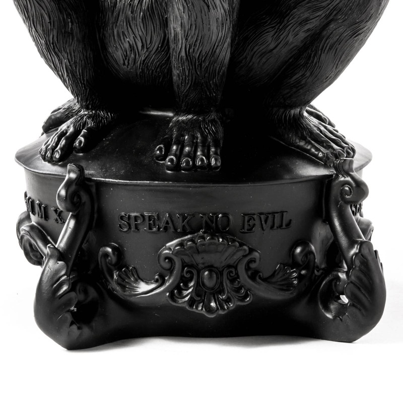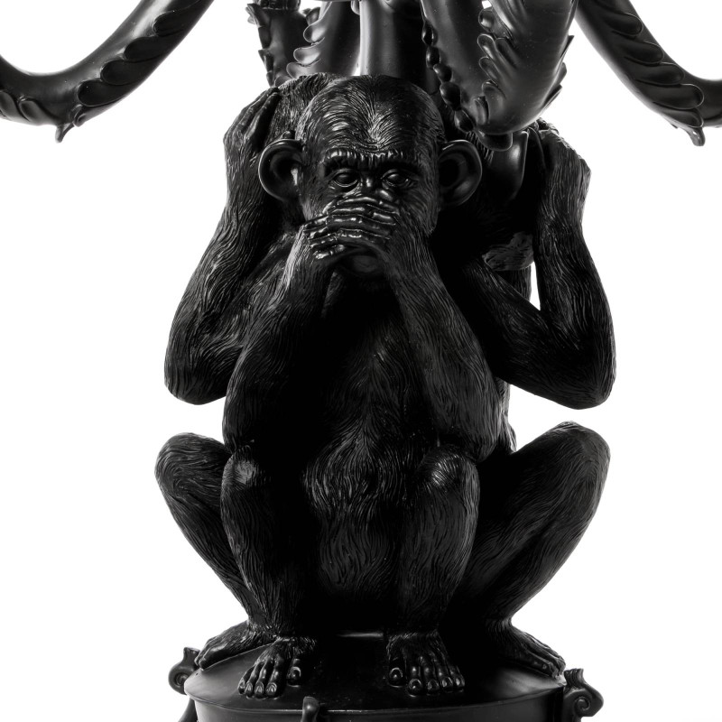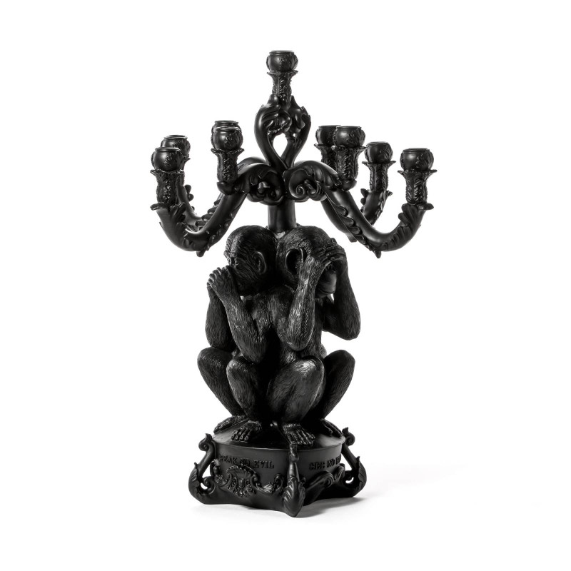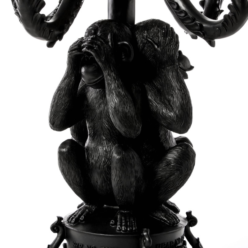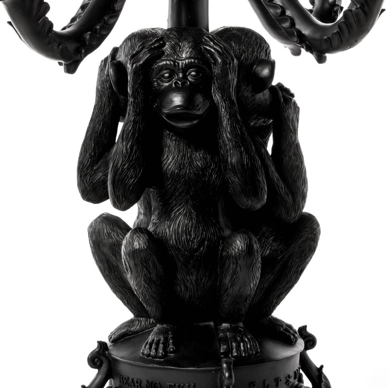 Сочетание креатива и функциональности – вот то, что отличает итальянский бренд Seletti среди других. Он специализируется на создании ультрасовременного декора для дома, который характеризуется не только концептуальными дизайнерскими решениями, но также качественными материалами и техническими особенностями. Подсвечник «Три обезьяны» входит в коллекцию Giant Burlesque. Он представляет собой композицию из известного символа отказа от совершения зла – трех фигур обезьян, которые закрывают глаза, уши и рот. Концепция: если я не вижу зла, не слышу о зле и ничего не говорю о нем, то я защищен от него. Подсвечник сделан из полирезина черного цвета. Полирезин - это современный полимерный материал с добавлением мраморной крошки. Он прочный, устойчивый к огню и влаге, экологичный, с не пористой структурой, которая обеспечивает сопротивление развитию микробов и плесени. Имеет пять ответвлений для свечей. Его высота – 60 см, вес – 5.5 кг. Подсвечник продается в упаковке с логотипом Seletti.