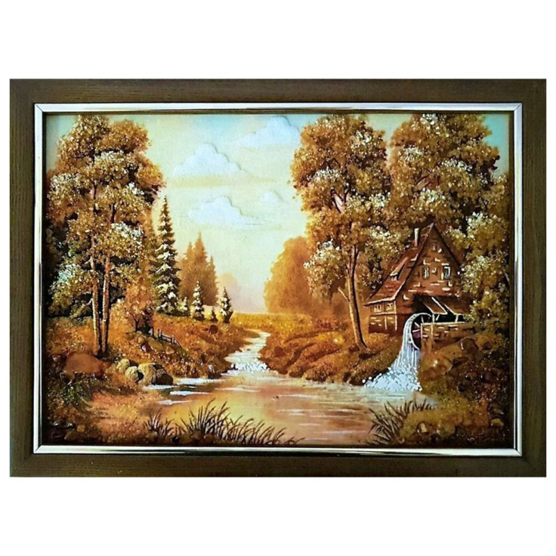 На картине изображен лесной дом с мельницей, на берегу реки. "Золотой" осенний пейзаж в котором художник искусно сочетал камни и искристую крошку янтаря, украсив ими листву деревьев, траву, камни у реки, брызги воды. Пейзаж "Дом с мельницей" станет достойным украшением вашего интерьера. Янтарный пейзаж можно преподнести в качестве очень дорогого подарка.