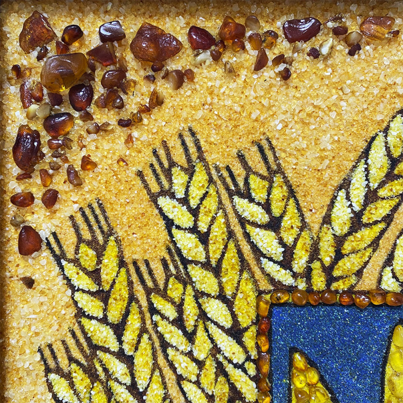 Данная картина - это произведение искусства ручной работы, выполненное мастером насыпной и наборной техникой. Для этого художник использовал янтарную крошку, а так же большие камни разных размеров.