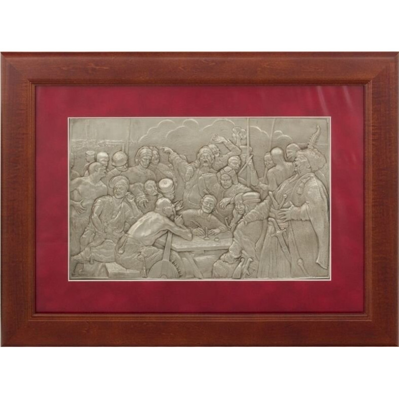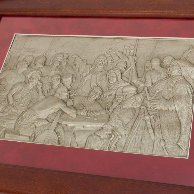 Подарочная картина "Казаки" - символ бесстрашия, жизнелюбия, оптимизма и "симфония человеческого хохота". Все это олицетворяет этот сувенир. Легенда гласит, что написан ответ запорожцев был в 17 веке, но историк Д. Яворницкий утверждает, что есть несколько списков этого текста, датируемых 1600, 1620, 1667, 1713 и еще многими не то что годами, а целыми веками. Слухи и домыслы также утверждают, что атаманом Сечи в то время был Иван Сирко. Исторические факты, напротив, сообщают, что замысел картины пришел к Репину, уроженцу украинской Слобожанщины, в 1878 году, когда был сделан первый эскиз, но окончательно композиция картины начала приобретать очертания в 1880 году и писалась долгих 9 лет. Историк Николай Костомаров подготовил маршрут Репину для путешествия по Украине для изучения исторического материала для картины. "Ну и народ! Голова оборотом идет от их гама и шума, веселый народ. Чертовский народ!" Это первоначальное впечатление Репина. А дальше его мнение углубляется и становится значительнее : "Наше Запорожье меня восхищает этой свободой, этим подъемом рыцарского духа, эта горсть удальцов... не только защищает всю Европу от восточных хищников, но грозит даже их сильной тогда цивилизации и от душ хохочет над их восточным высокомерием". Отдельно следует сказать о натурщиках: атаман Сирко, колоритный персонаж картины и истории, написан с киевского генерал-губернатора М. Драгомирова, старый казак в белой папахе - с "акулы пера " того времени Гиляровского, а вот образ писаря воплотил Д. Яворницкий. А теперь о тех персонажах, которые напрямую перекликаются с гоголевским "Тарасом Бульбой": красивый молодой человек на заднем плане племянник М. Глинки, его считают прототипом Андрия, а вот одессит Николай Кузнецов, с которого написан раненный в голову казак, считается Остапом. Напротив сыновей - сам Тарас, то есть, профессор консерватории Петербурга А. Рубец, кстати, шляхетского происхождения.
