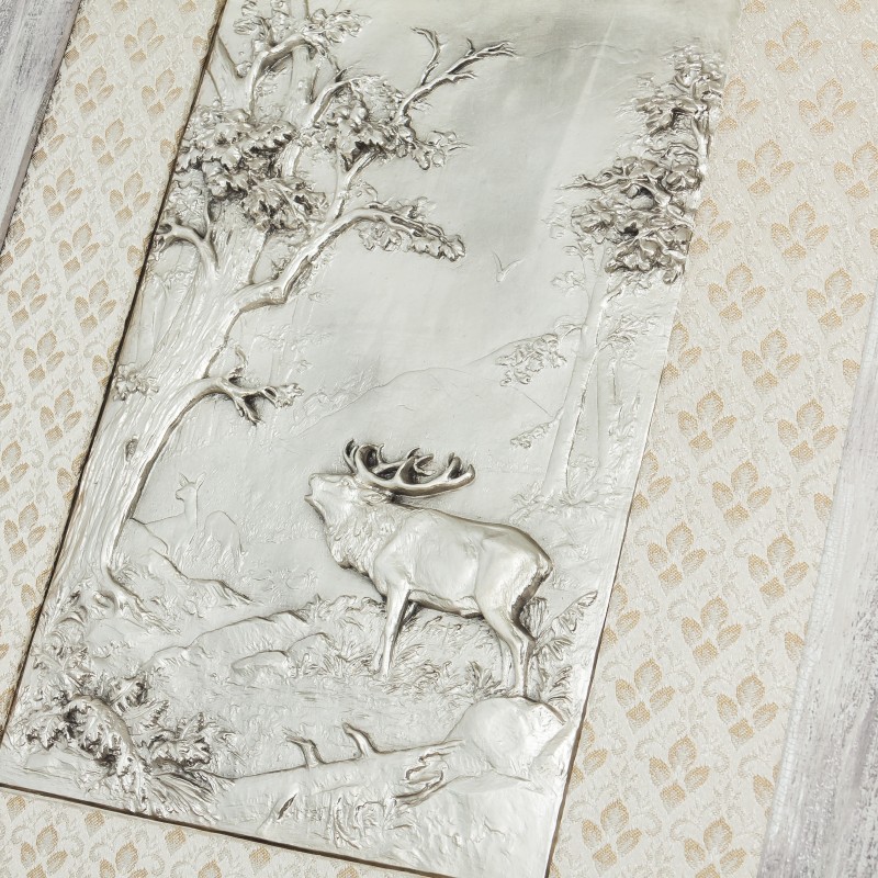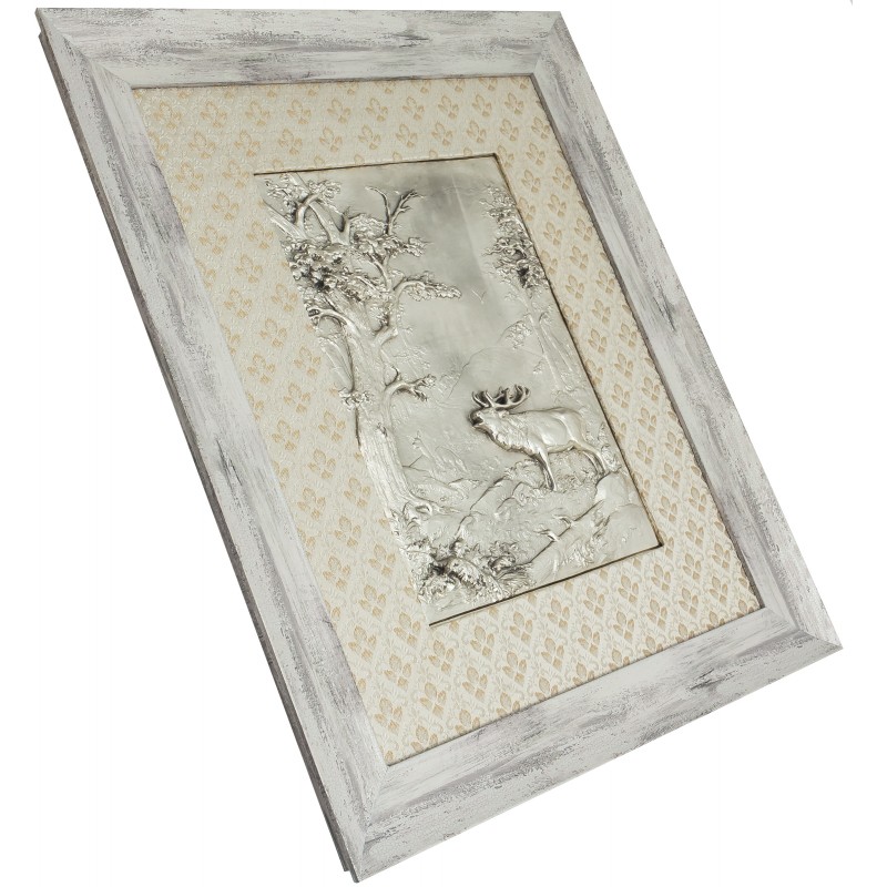 Величественный лось, символ силы и благородства, изображен в окружении лесного пейзажа. Картина выполнена в технике гальванопластики с использованием серебра и текстильного фона. Изящный багет дополняет композицию, делая ее еще более выразительной. "Лось" станет идеальным подарком для любителей природы и животных, ценителей эксклюзивных предметов интерьера. Тех, кто хочет сделать по-настоящему роскошный и запоминающийся подарок.
