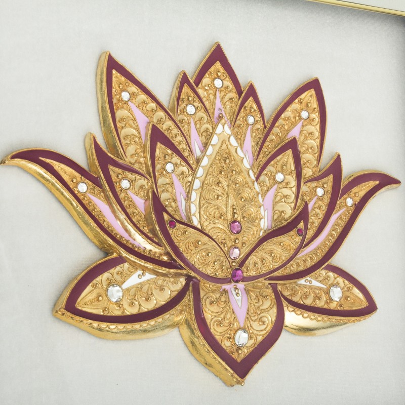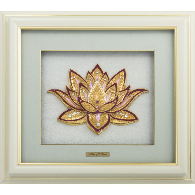 Данная картина "Лотос" оформлена в багет белого цвета. Сама накладка изготовлена из меди, сверху покрыта позолотой. Декорирована патиной и камнями. Фоновая основа выполнена из ткани белого цвета, картина имеет двойную раму.
