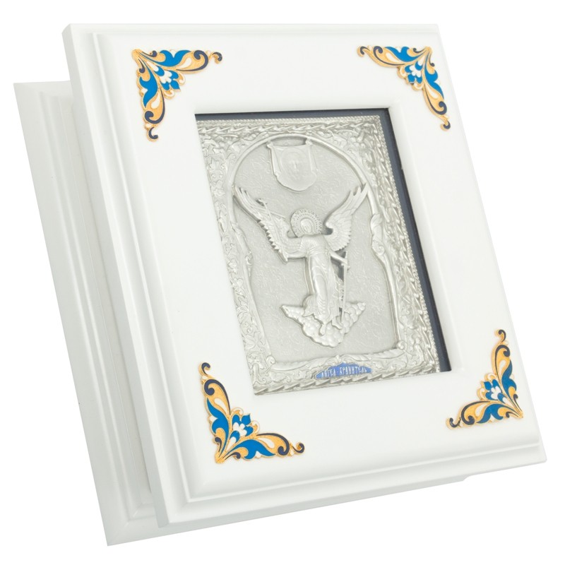 Данная настенная ключница изготовлена в белом цвете и защищена плотным стеклом. Внутреннее основание изготовлено из прочной ткани - бархат. Крышка украшена накладкой из меди, с изображением Ангела Хранителя сверху покрыта серебром, декорирована художественной ювелирной эмалью.