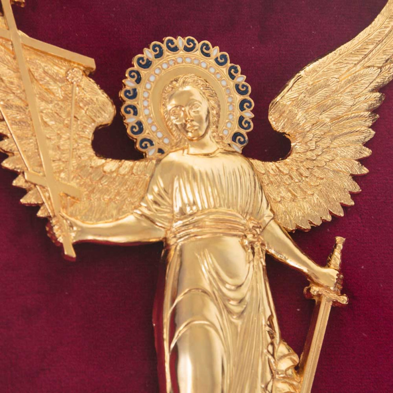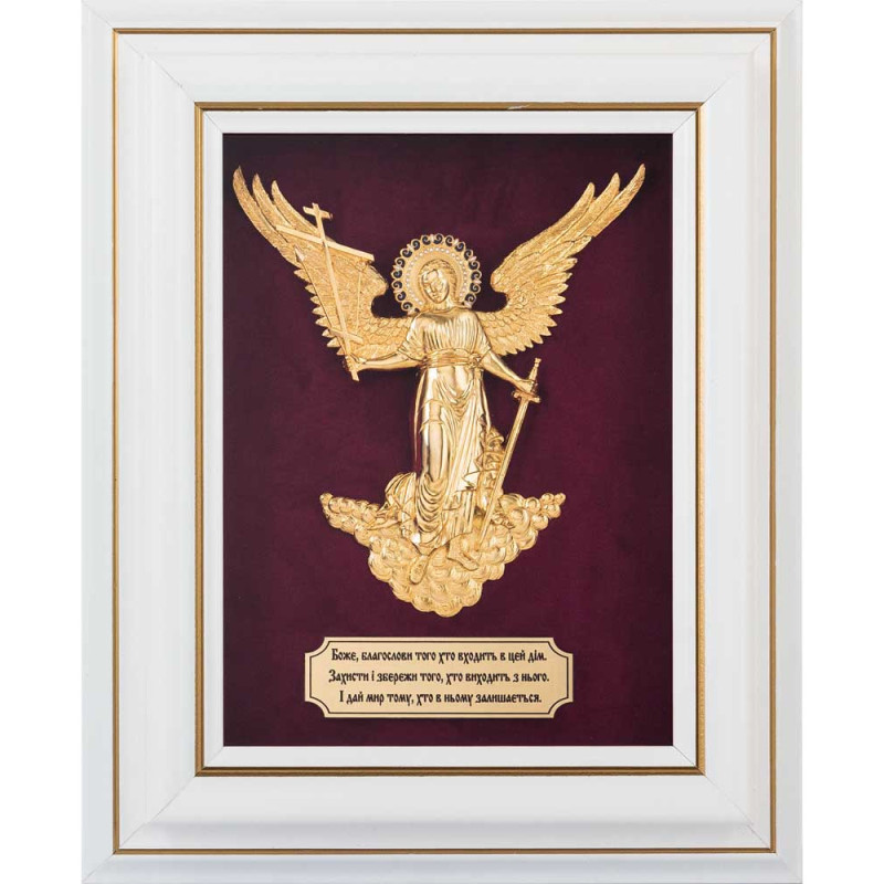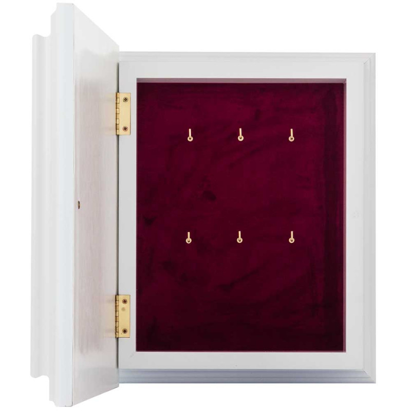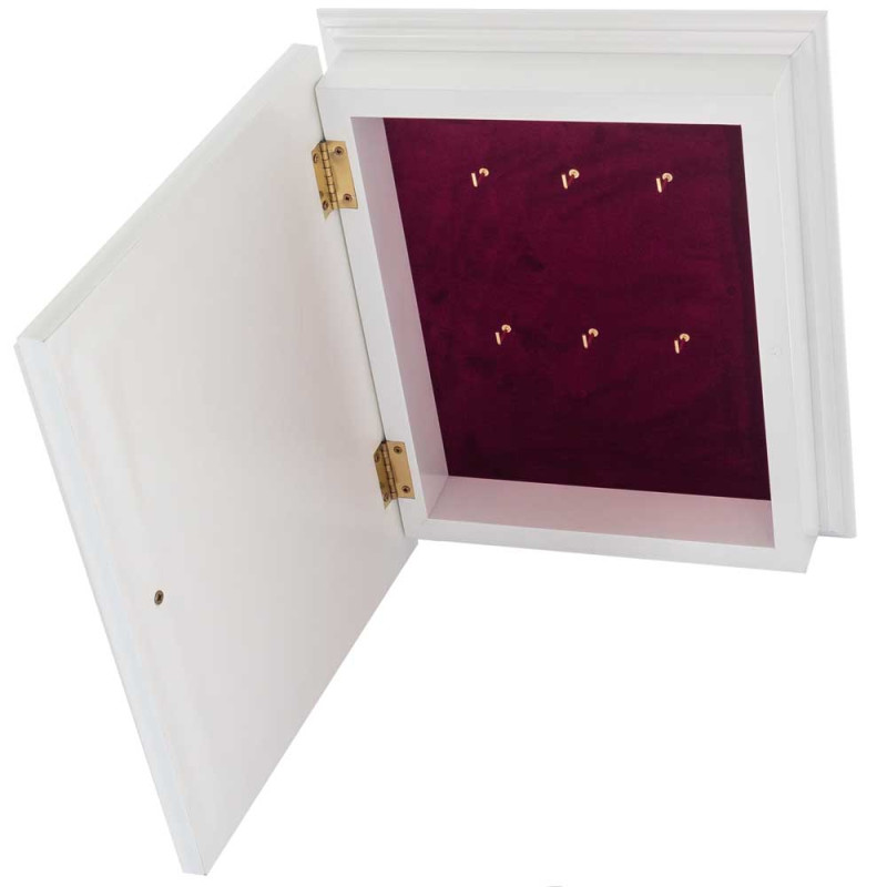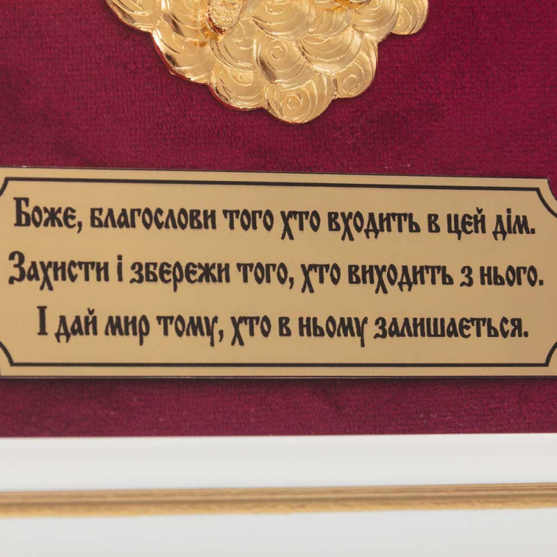 Данная настенная ключница выполнена из дерева, полностью покрыта защитным лаком и защищена плотным стеклом. Внутренняя основа изготовлена из прочной ткани - бархат бордового цвета. Крышка украшена накладкой из меди, с изображением Ангела Хранителя, сверху покрыта золотом, декорирована художественной ювелирной эмалью.