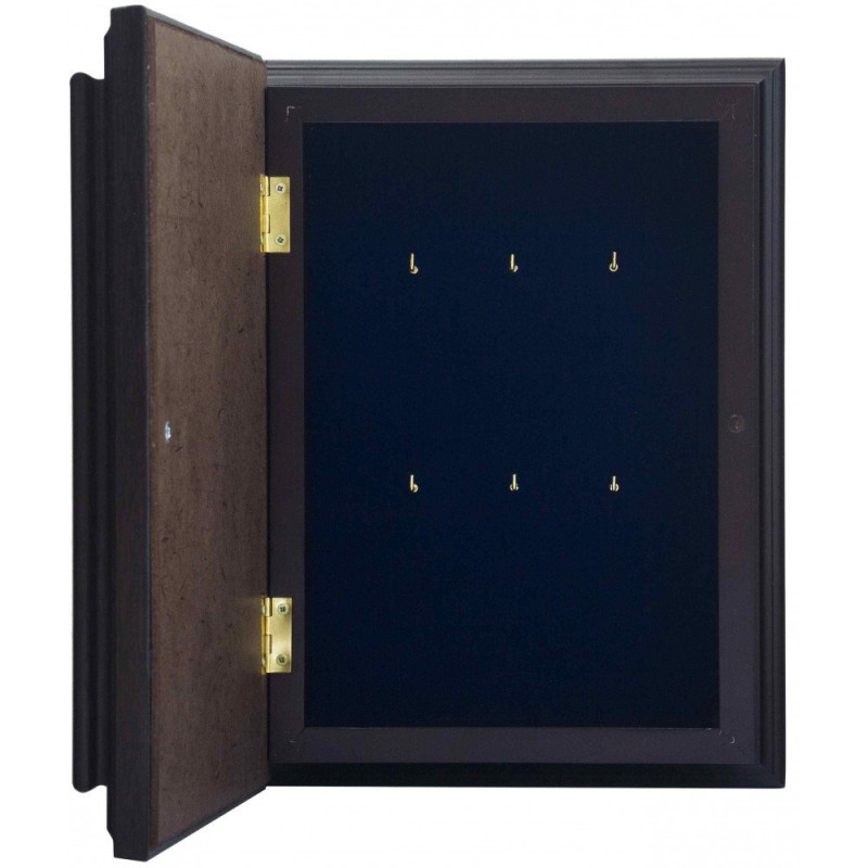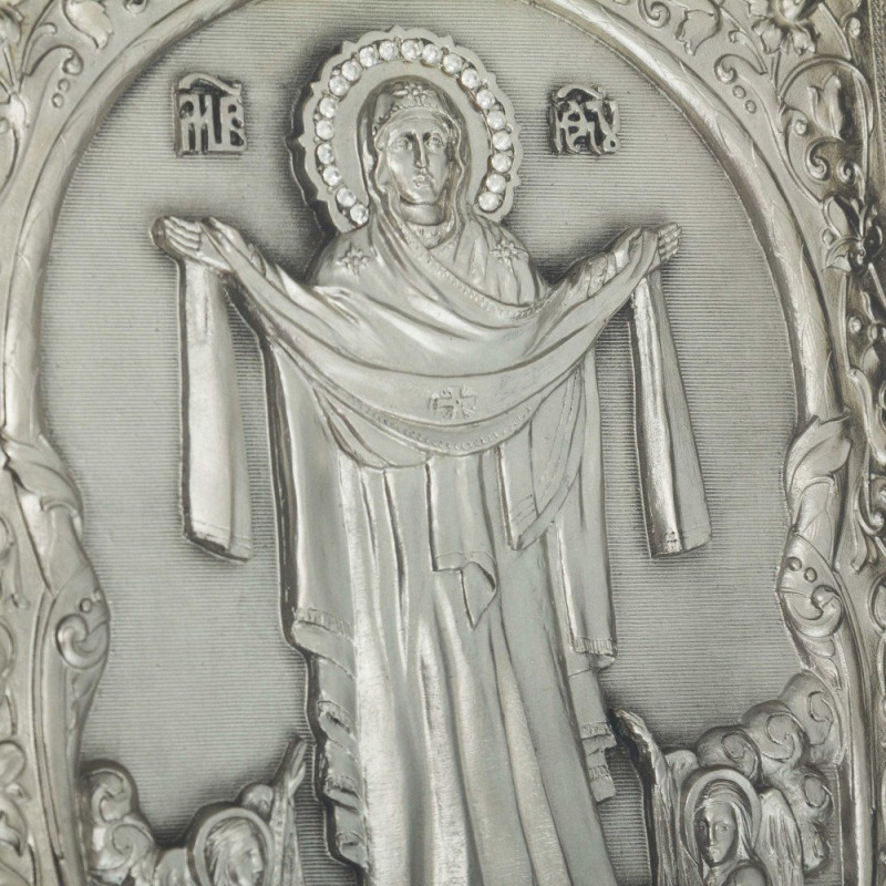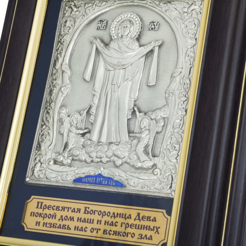 Данная настенная ключница полностью покрыта защитным лаком и защищена плотным стеклом. Внутренняя основа изготовлена из прочной ткани - бархат синего цвета. Крышка украшена накладкой из меди, с изображением Пресвятой Богородицы Покровы, сверху покрыта серебром, декорирована художественной ювелирной эмалью и патиной.