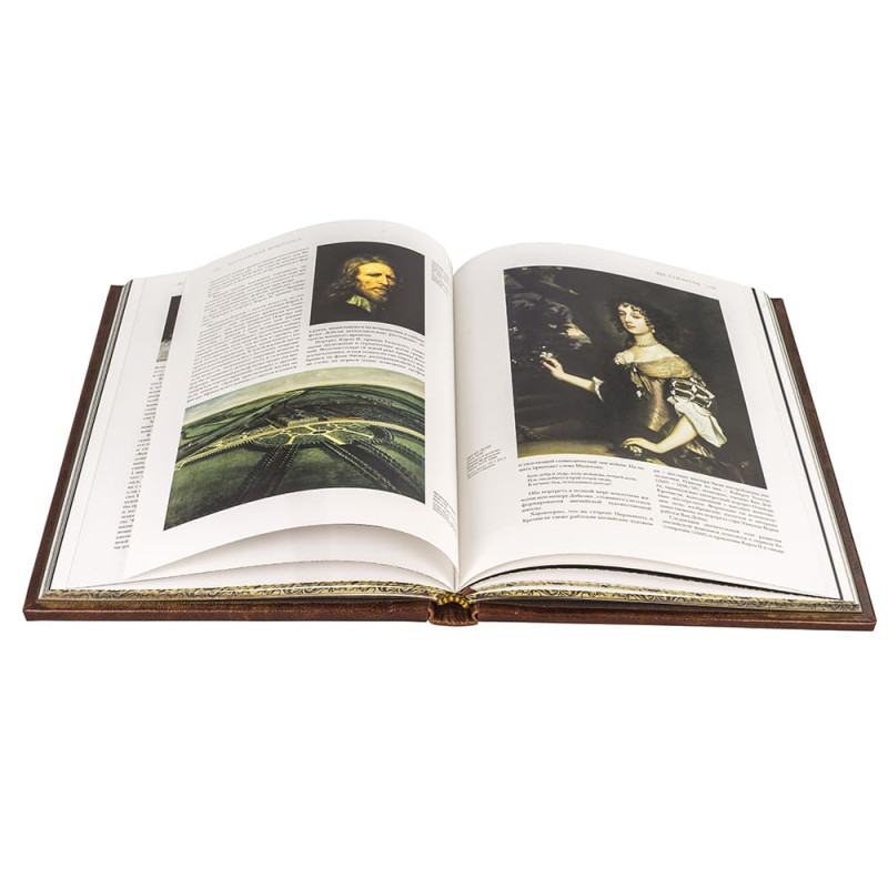 Составной переплет "Брадель", ручной работы, изготовлен из натуральной кожи "Robbat Cognac" производства итальянской кожевенной фабрики "Carisma". Обложка книги оформлена комбинацией рельефного тиснения: глубокого блинтового и золотого, с использованием фольги "Luxor 240", а также декорирована вставкой из холста с художественной фотопечатью. Обрез книги выполнен в уникальной технике позолоты с нанесением орнамента. Персональный сертификат с индивидуальным текстом поздравления. Бархатный мешочек. Деревянная коробка.