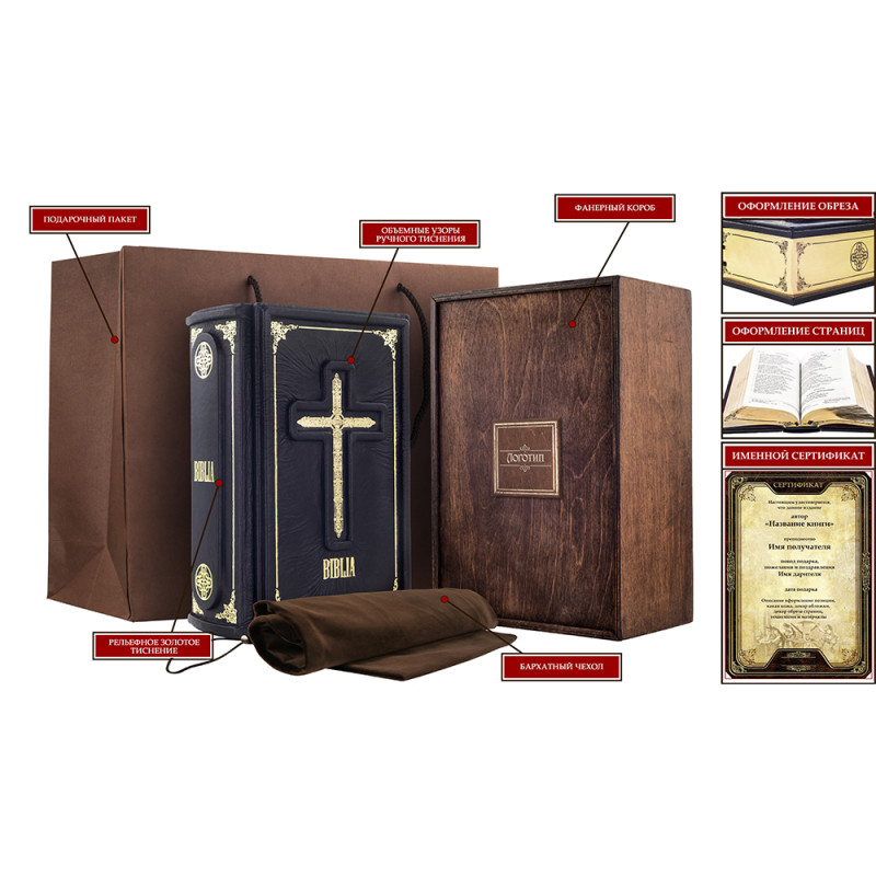 Составной переплет "Брадель" ручной работы, изготовлен из натуральной телячьей кожи "Nero" производства итальянской кожевенной фабрики "Carisma". Обложка двухуровневая, оформлена в технике высокого барельефа и декорирована золотым тиснением, с использованием фольги "Luxor 240". Обрез книги выполнен в авторской технике золочения с нанесением орнамента.