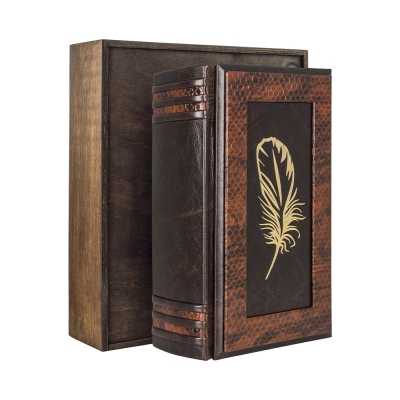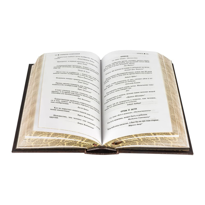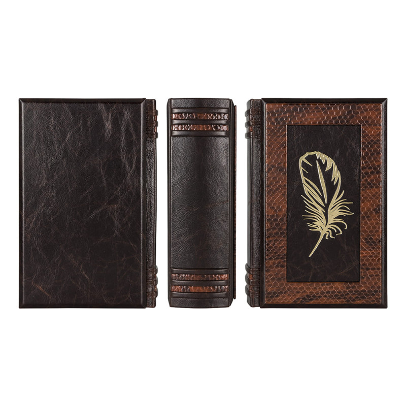 Составной переплет "Брадель", ручной работы, изготовлен из комбинации натуральных кож "Grash" и кожи морской змеи производства ведущих итальянских фабрик. Обложка книги оформлена рельефным золотым тиснением, с использованием фольги "Luxor 240". Обрез книги выполнен в авторской технике позолоты с нанесением орнамента.