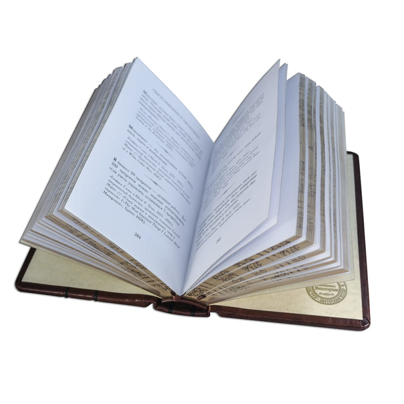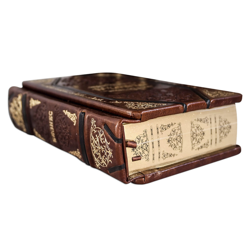 Составной переплет "Брадель", ручной работы, выполнен из комбинации натуральных кож (кожа теленка "Robbat Cognac", кожа "Robbat Wisky" производства итальянской кожевенной фабрики "Benericetti"). Обложка книг и футляр оформлены многоуровневым тиснением: глубоким блинтовым и рельефным золотым (использована фольга "Luxor 240"). Обрез книг вручную полирован и выполнен в уникальной технологии художественной запечатки золотой основы.