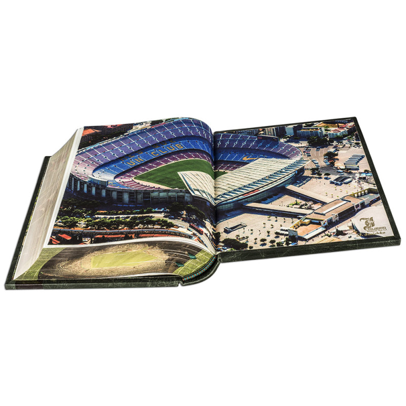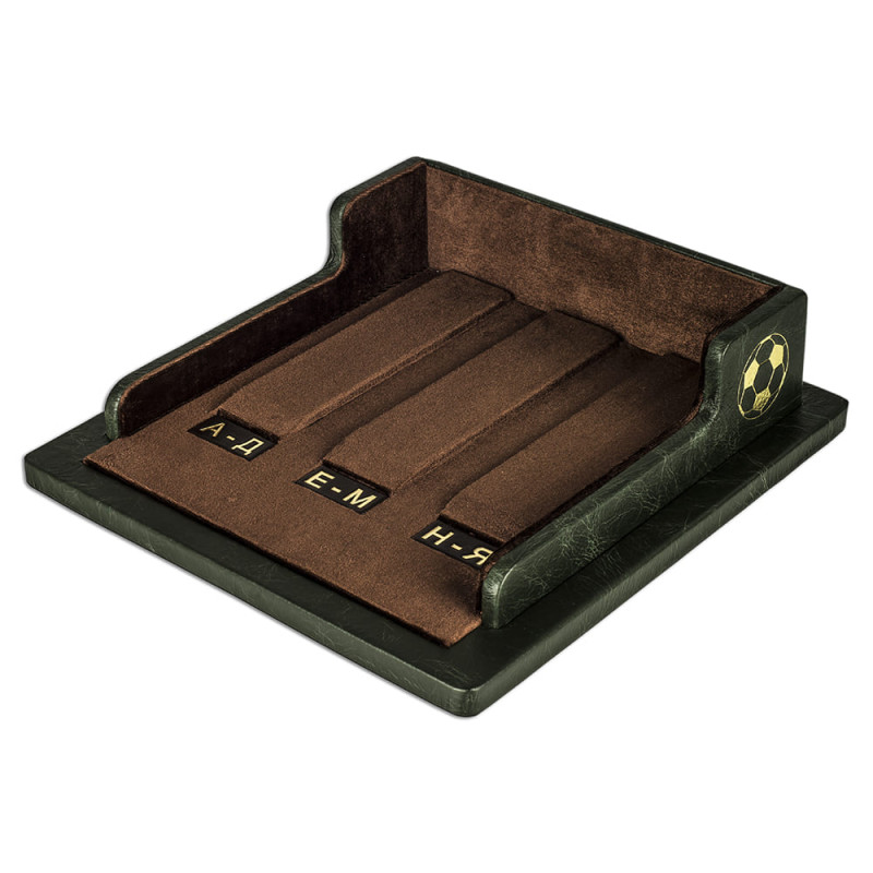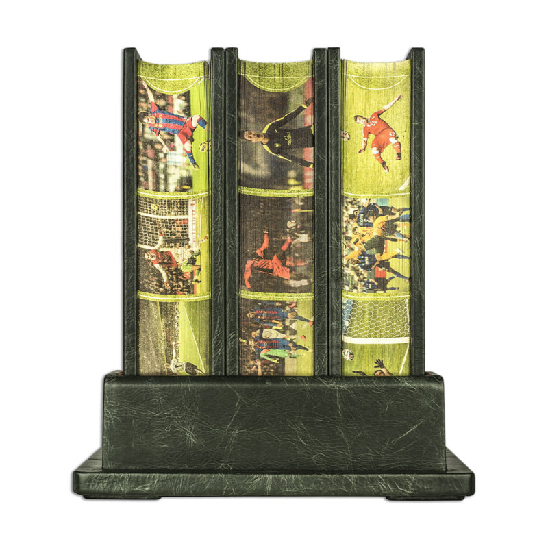 Составной переплет "Брадель", ручной работы, выполнен из комбинации натуральных кож (кожи "Gabinetto Green" и кожи "Perugia Brown" производства итальянской кожевенной фабрики "Carisma"). Обложки книг оформлены рельефным золотым тиснением, c использованием фольги "Luxor 240", а также декорированы вставками из холста. Обрезы книг выполнены в уникальной технике позолоты с нанесением художественной репродукции. Подставка выполнена в том же стиле что и книги.
