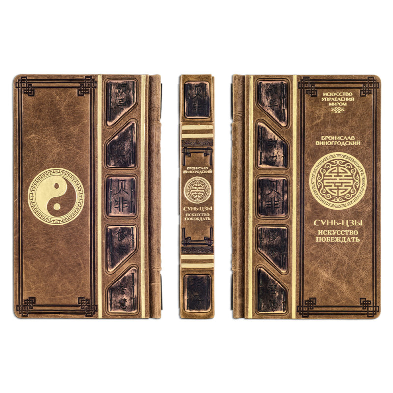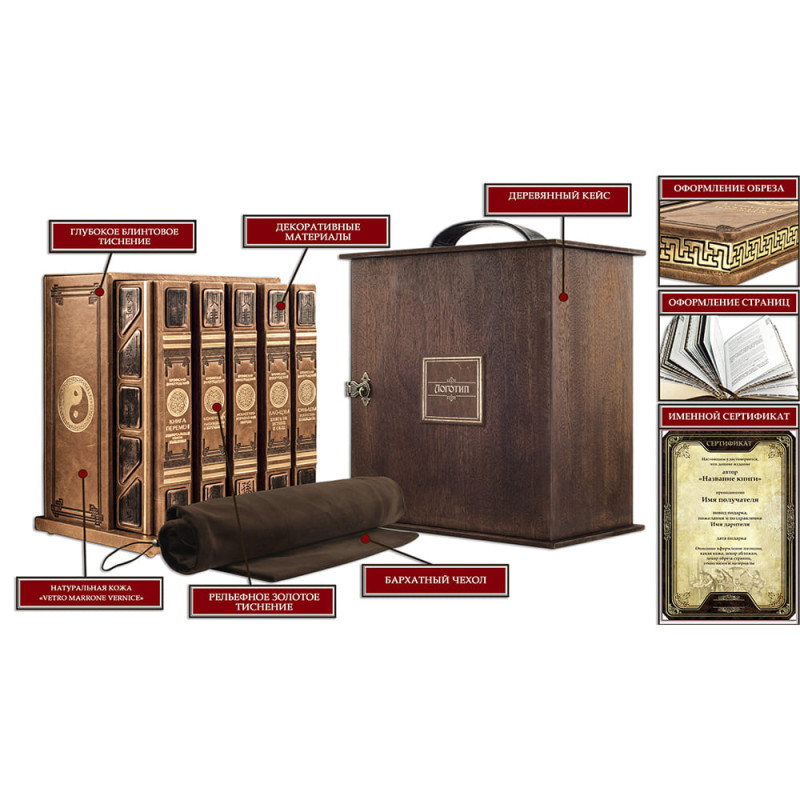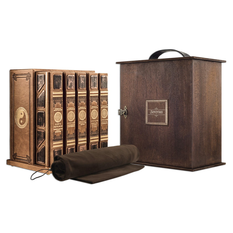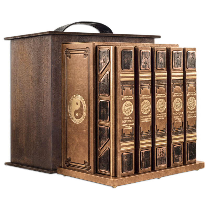 Составной переплет "Брадель", ручной работы, выполнен из эксклюзивной кожи "Vetro marrone vernice" производства итальянской фабрики "Carisma". Обложки книг и подарочный пенал оформлены многоуровневым тиснением: глубоким блинтовым и рельефным золотым, а также медными элементами с чеканкой китайских иероглифов. Форзацы книг выполнены из холста с цветной печатью репродукций древних восточных полотен. Обрезы книг вручную позолочены и декорированы глубокой гравировкой. Все пять томов заключены в роскошный пенал, обшитый кожей, оформленный в едином стиле с книжными обложками.