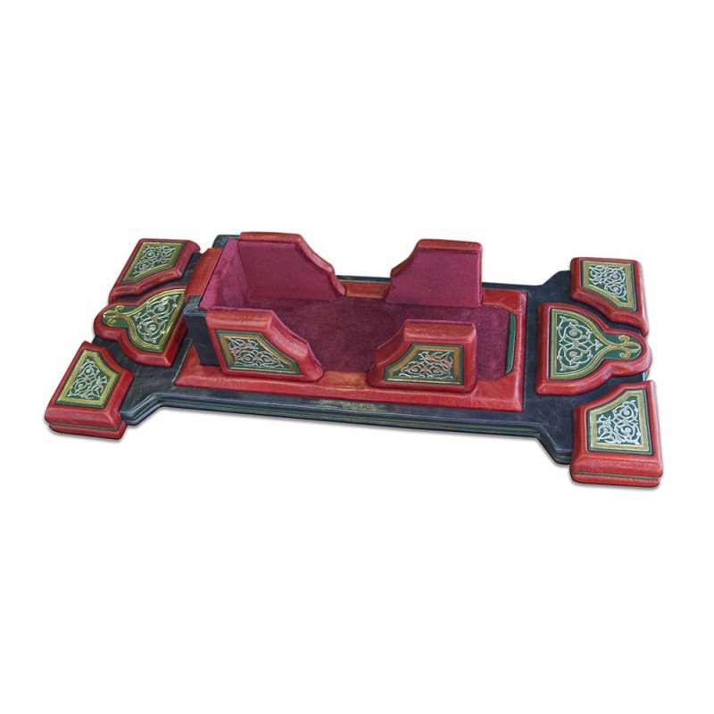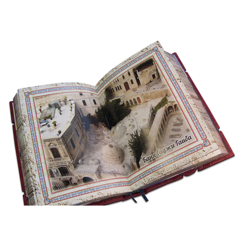 Составной переплет "Брадель", ручной работы, изготовлен из комбинации натуральных кож (кожа "Robbat blue", "Robbat Rossa", "Smeraldo" производства итальянской кожевенной фабрики "Carisma"). Обложка книги и подставка двухуровневые, оформлены комбинацией золотого и серебряного тиснения. Книга декорирована вставкой холста с художественной фотопечатью. Обрезы книг оформлены в уникальной технике "Old Gold".