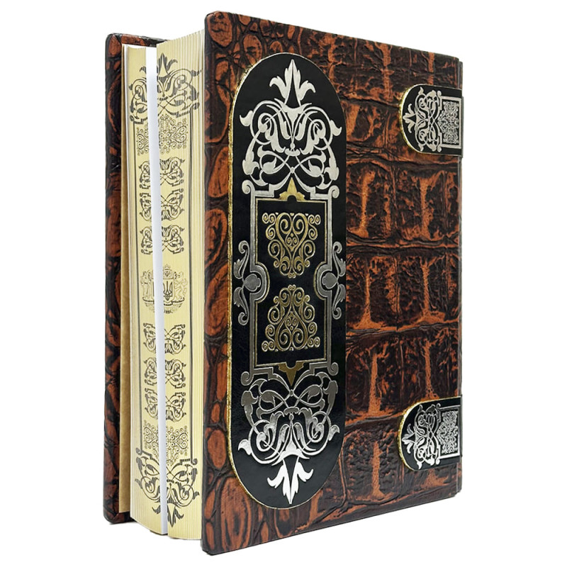Составной переплет "Брадель", ручной работы, изготовлен из комбинации натуральных кож (кожа "Argento dinosauro", кожа "Robbat nero" производства итальянской кожаной фабрики «Carisma»). Обложка книги двухуровневая, оформлена рельефным золотым и серебряным тиснением, с использованием фольги "Luxor 240".