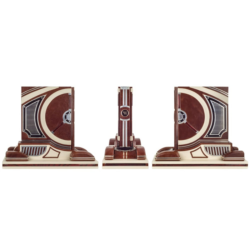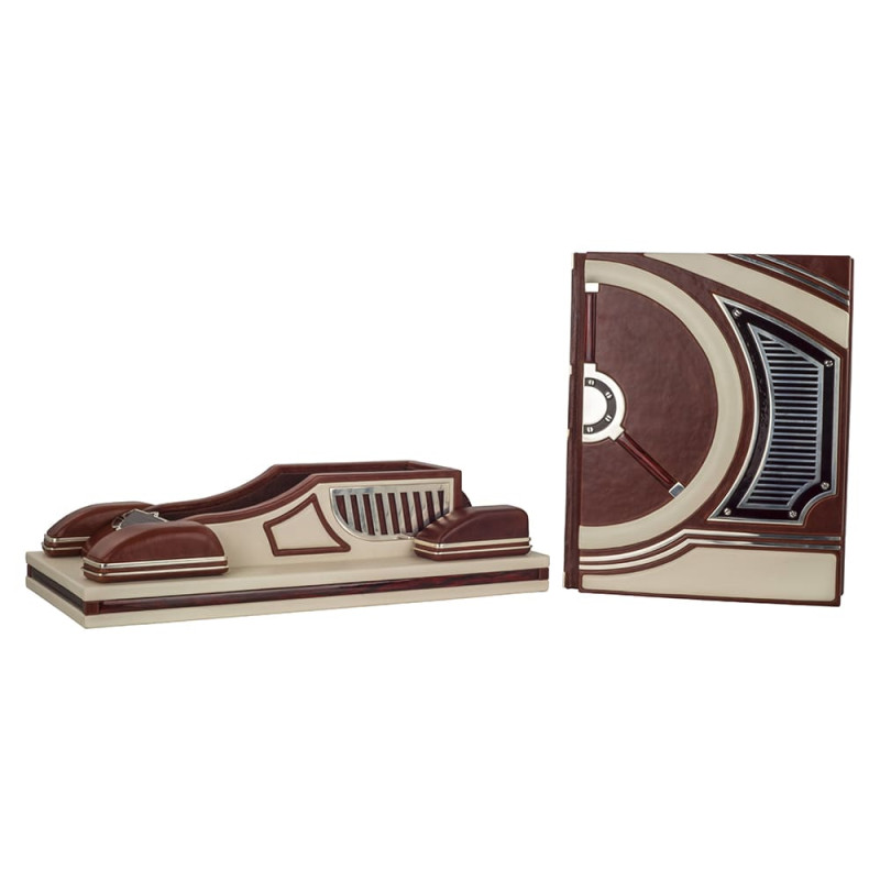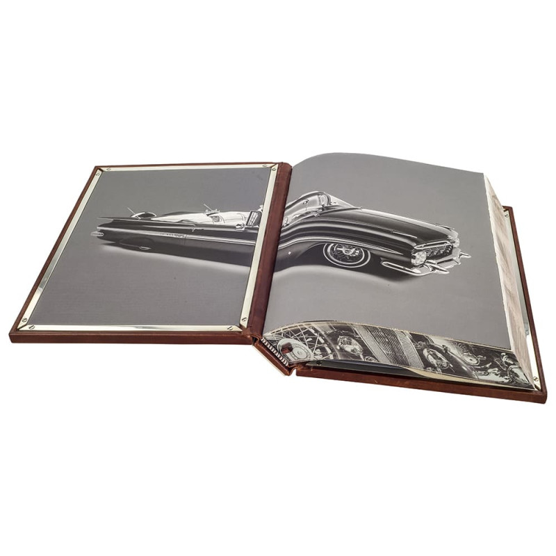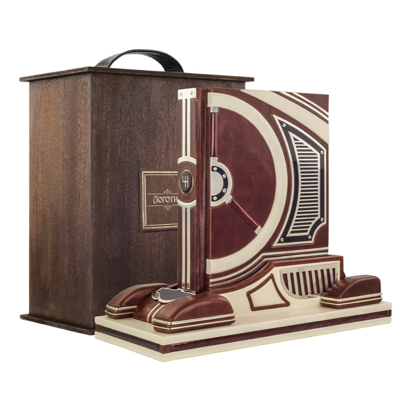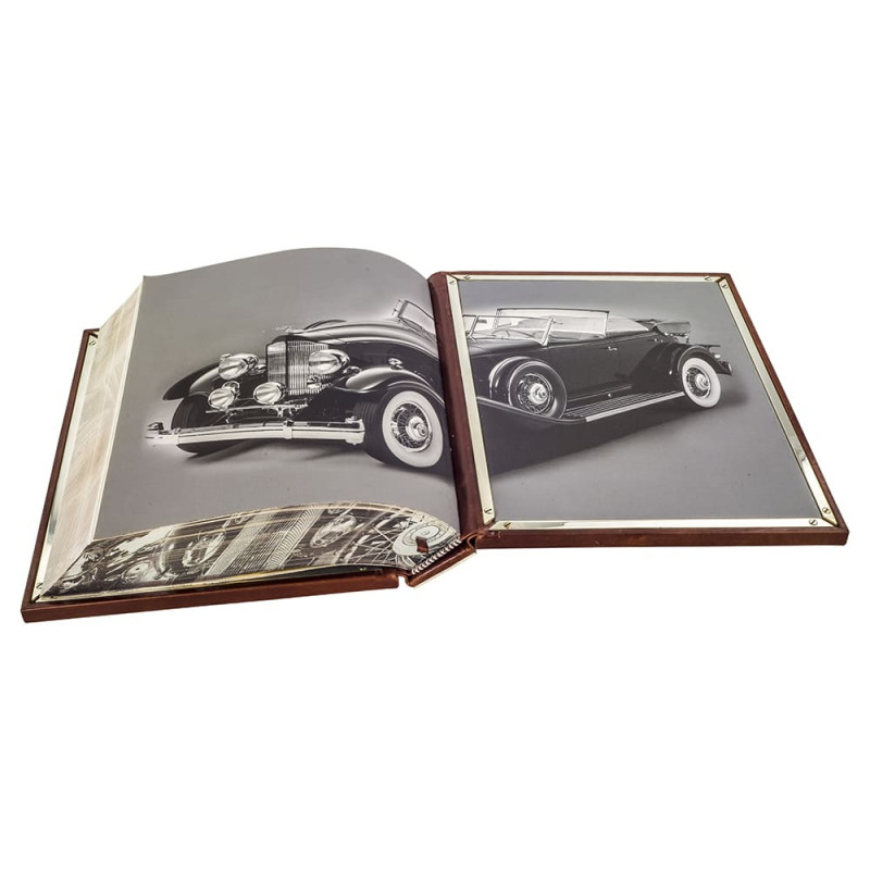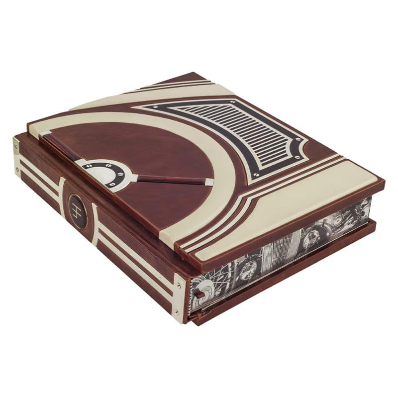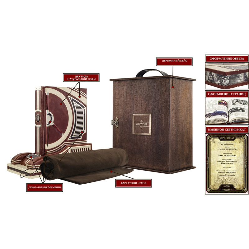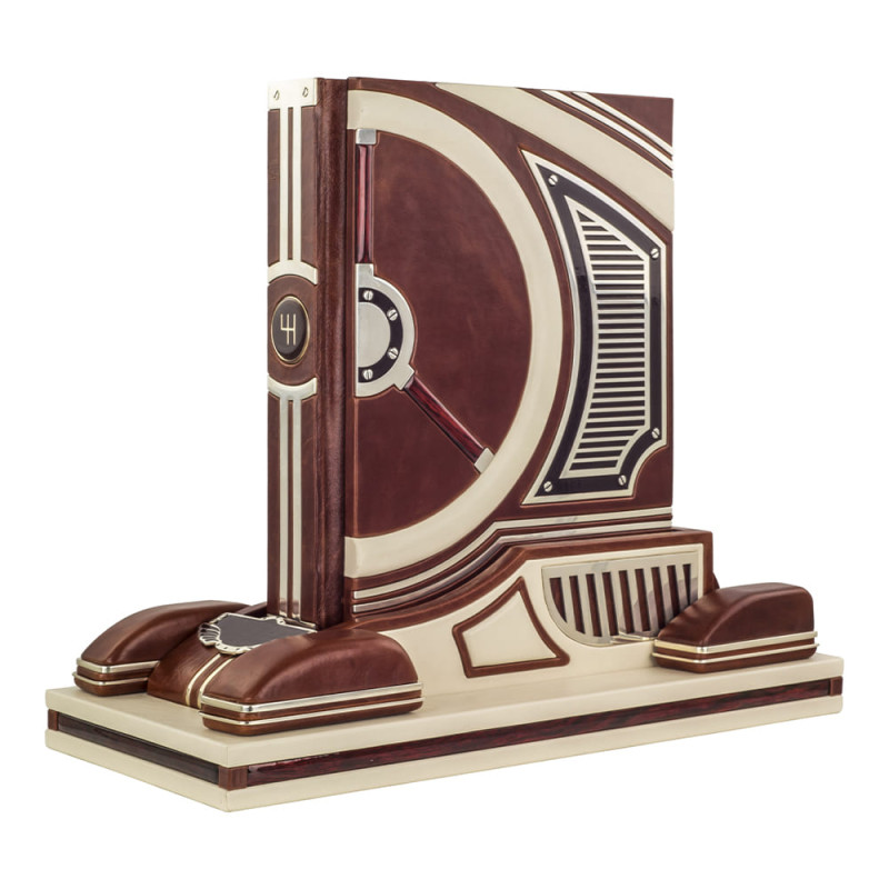 Составной переплет "Брадель" ручной работы, выполнен из комбинации натуральных кож "Robbat Cognac" и "Scarlete Beige" производства итальянской кожевенной фабрики "Benericetti". Обложка книги двухуровневая, декорирована латунными накладками. Обрез книги выполнен в уникальной технике позолоты с нанесением художественной репродукции. Подставка выполнена в том же стиле что и книга.