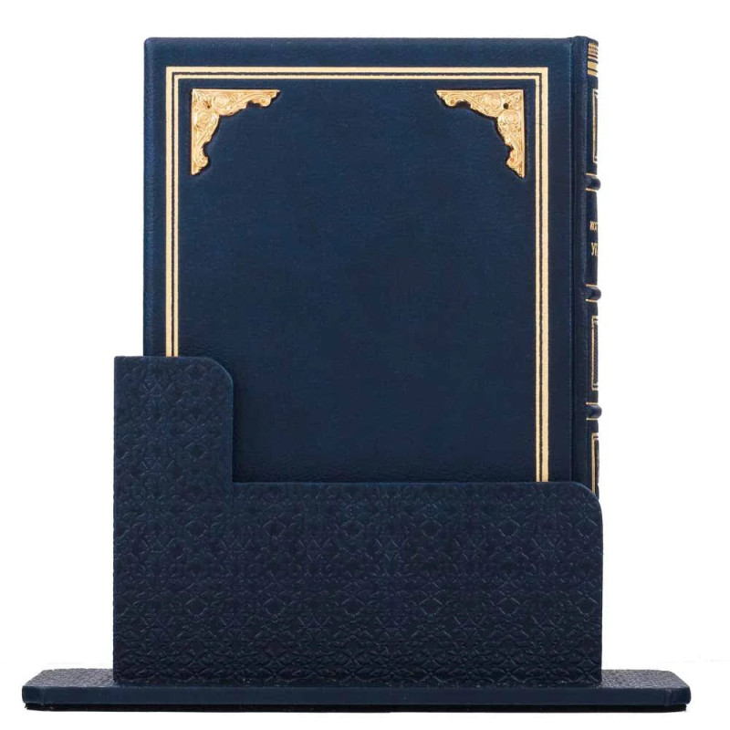 Книга оформлена в переплет из натуральной кожи, что придает ей солидность и долговечность. Обложка украшена медной накладкой в виде трезубца, покрытой позолотой, что придает книге элегантный и роскошный вид. По всему периметру книги выполнено тиснение золотом, создавая изысканный и утонченный узор. Особое внимание привлекает синий обрез страниц, который добавляет книге индивидуальности и неповторимого стиля. Такой дизайн делает эту книгу не только приятной для чтения, но и настоящим украшением любой библиотеки. Книга комплектуется кожаным футляром.