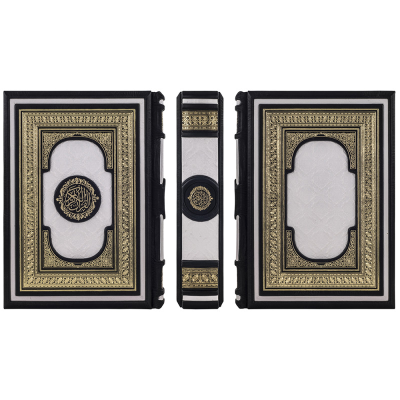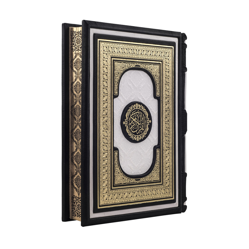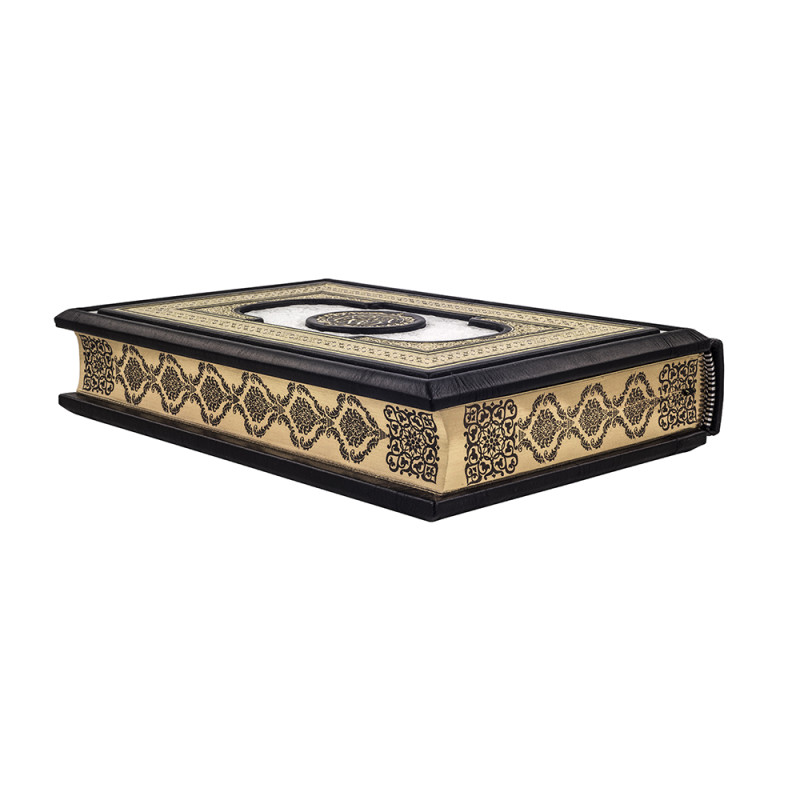 Составной переплет "Брадель" ручной работы, изготовлен из натуральных кож "Latte" и "Nero" производства итальянской кожевенной фабрики "Carisma". Обложка двухуровневая, оформлена рельефным золотым тиснением, с использованием золотой фольги "Luxor 240". Обрез книги выполнен в авторской технике золочения с нанесением орнамента.