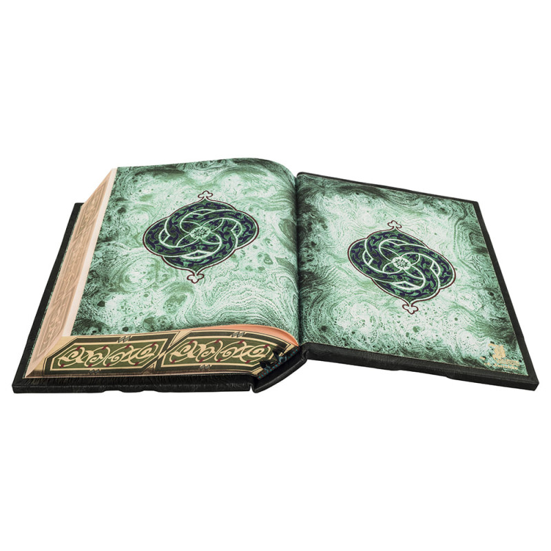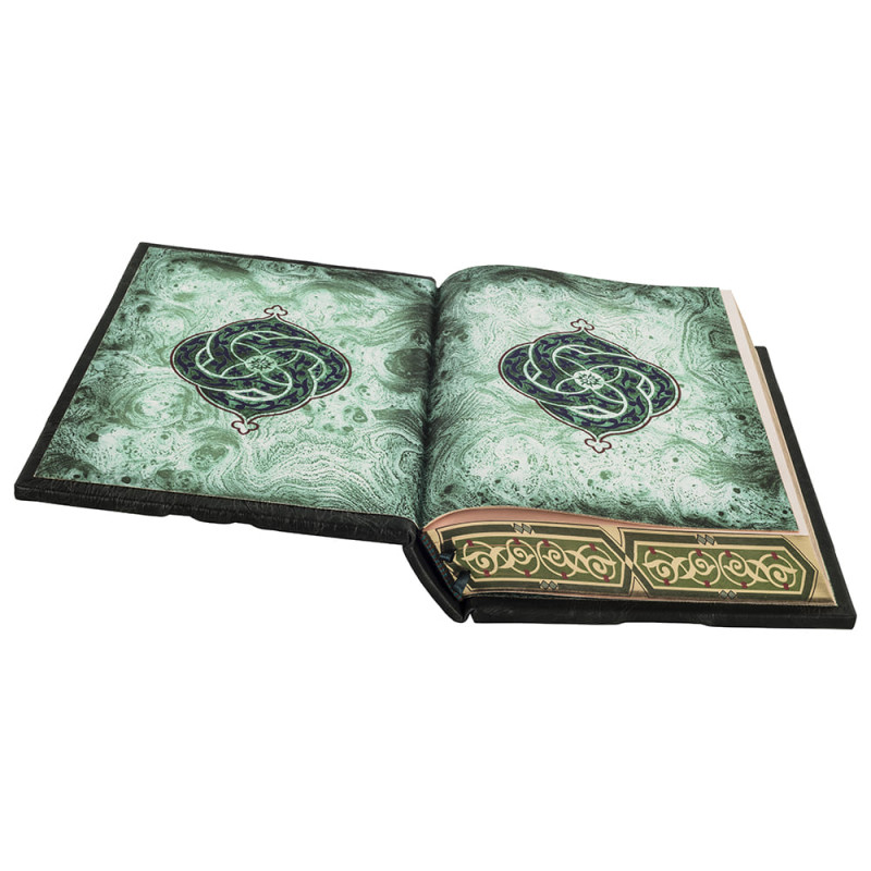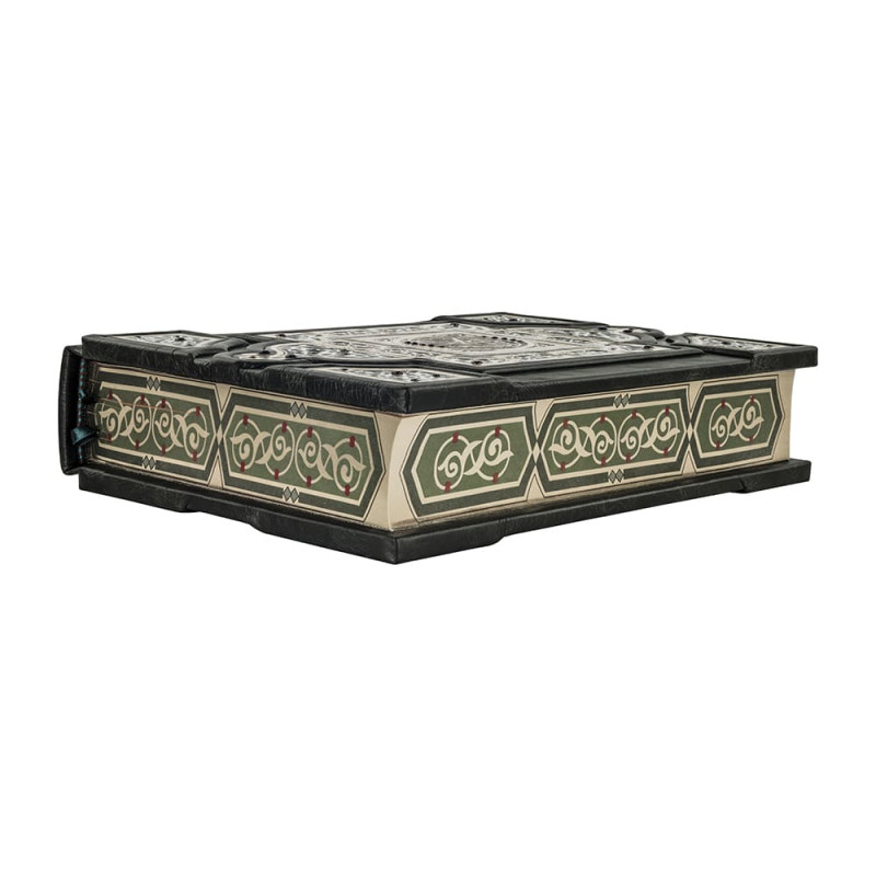 Составной переплет "Брадель", ручной работы, выполнен из комбинации натуральных кож "Robbat wisky" и "Smeraldo", производства итальянской кожевенной фабрики "Carisma". Обложка книги многоуровневая, оформлена комбинацией золотого и серебряного тиснения, с использованием фольги "Luxor 240". Инкрустирована камнями "Swarovski". Обрез книги выполнен в авторской технике позолоты с нанесением орнамента.