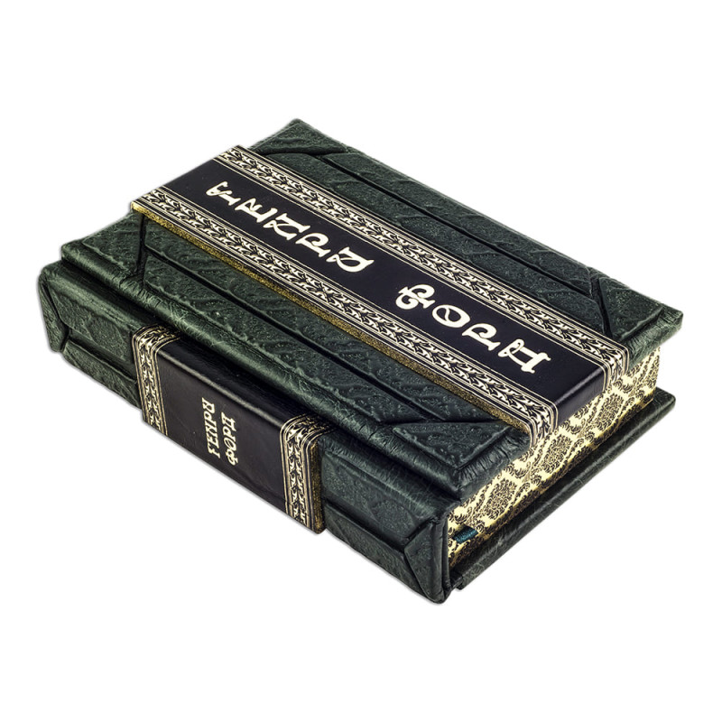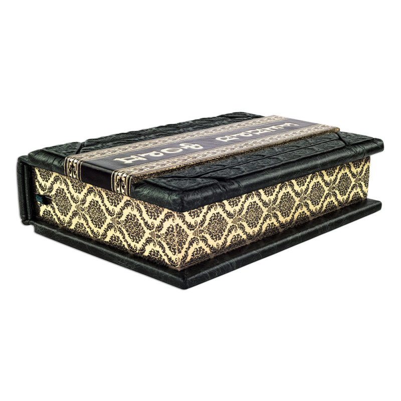 Составной переплет "Брадель", ручной работы, выполнен из комбинации натуральных кож (кожа теленка "Gabineto Green", кожа "Sparta esil" производства итальянской кожевенной фабрики "Carisma"). Обложка книги оформлена комбинацией многоуровневого объемного тиснения: рельефного золотого, c использованием фольги "Luxor 240" и глубокого блинтового. Обрез книги выполнен в уникальной авторской технологии художественной запечатки золотой основы.