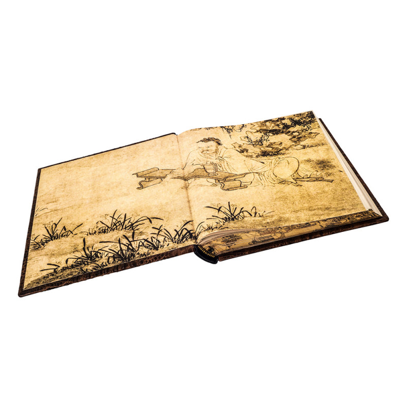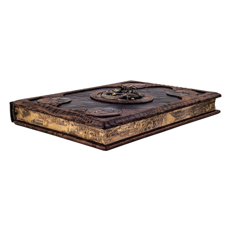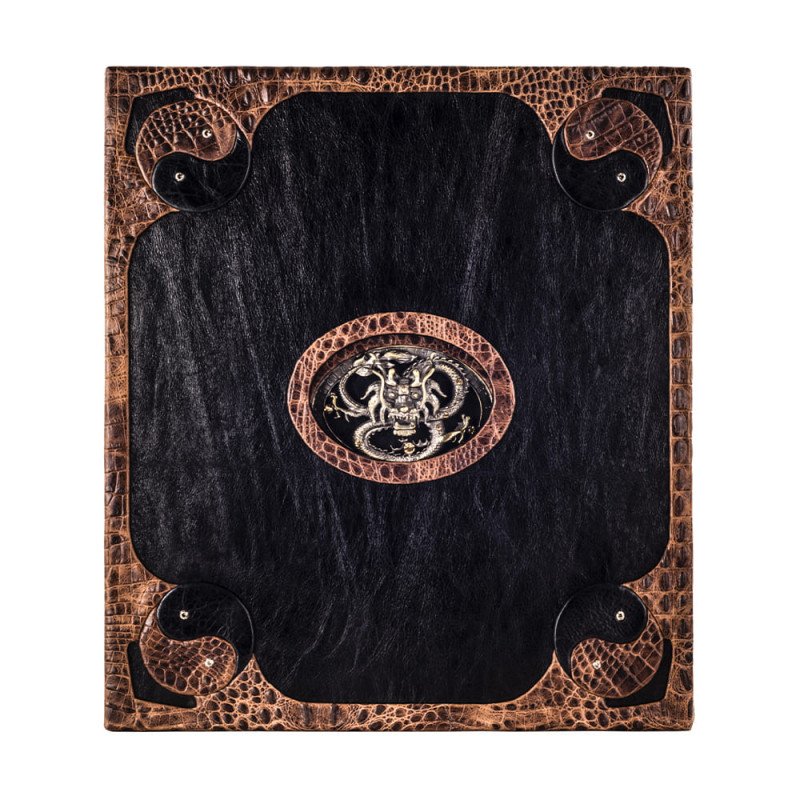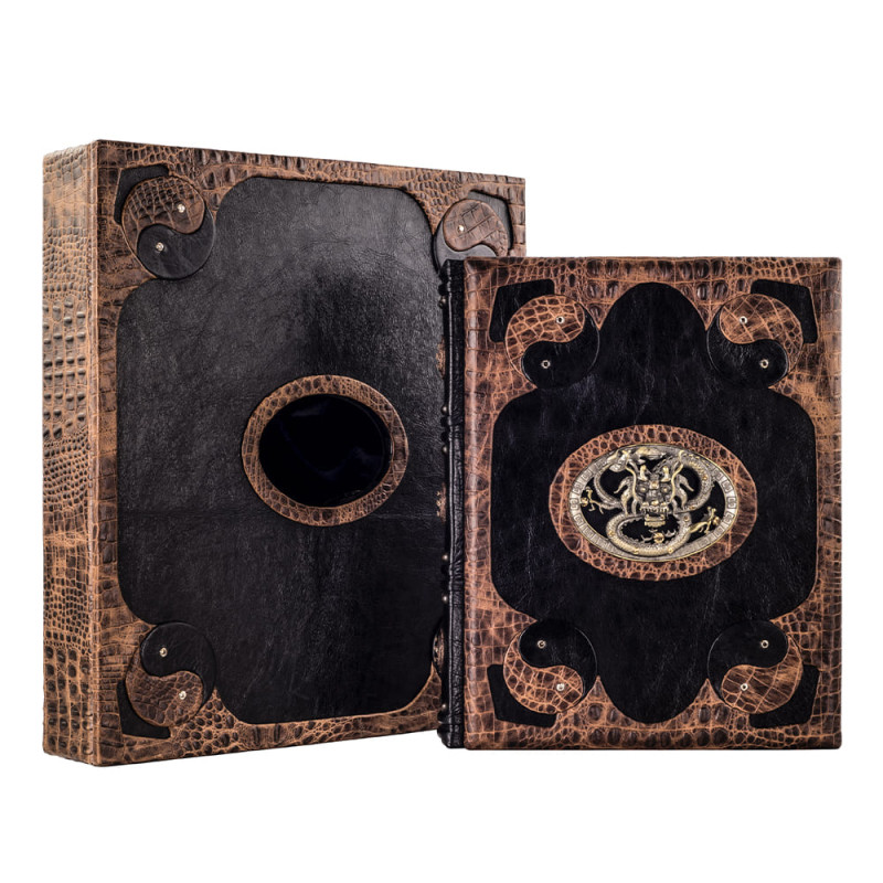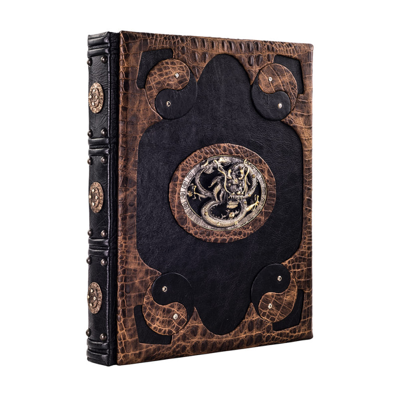 Составной переплет "Брадель", ручной работы, выполнен из комбинации натуральных кож "Elefante Geox" и "Crocozombo" производства итальянской кожевенной фабрики "Claudio". Обложка книги и футляр инкрустированы камнями циркон брильянтовой огранки (диаметр 5 мм., высший сорт, производства компании "Swarovski") общим количеством 16 штук, фурнитурой "Just Cavalli", количеством 3 штук, латунными холитенами, количеством 12 штук, художественным литьем "Китайский Дракон". Обрез книги выполнен в уникальной технике позолоты с нанесением художественной репродукции.