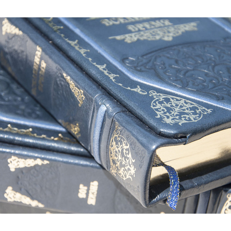 Французский составной переплет ручной работы выполнен из комбинации натуральных кож (кожа "RobbatBlu", кожа "Cielo" производства итальянской кожевенной фабрики "Benericetti"). Обложка книги и футляр- ложемент оформлены многоуровневым тиснением: глубоким блинтовым и рельефным золотым, с использованием фольги "Luxor 240". Внутреннее убранство футляра устлано натуральным бархатом "Morbidezza". Обрез книги вручную полирован и позолочен (цвет "Bronze").