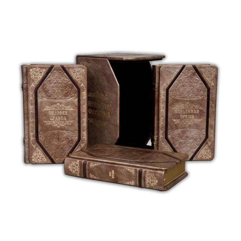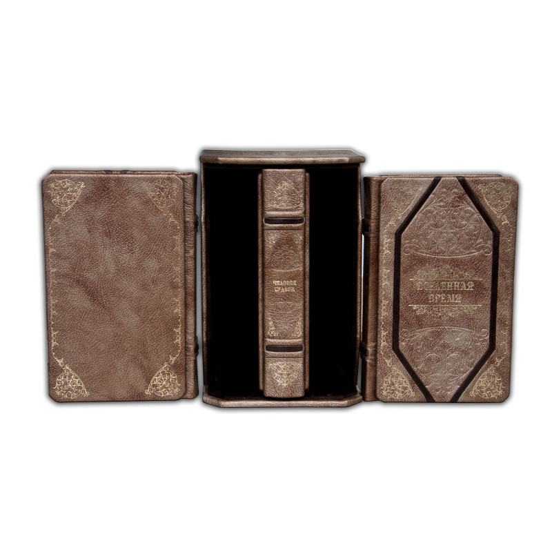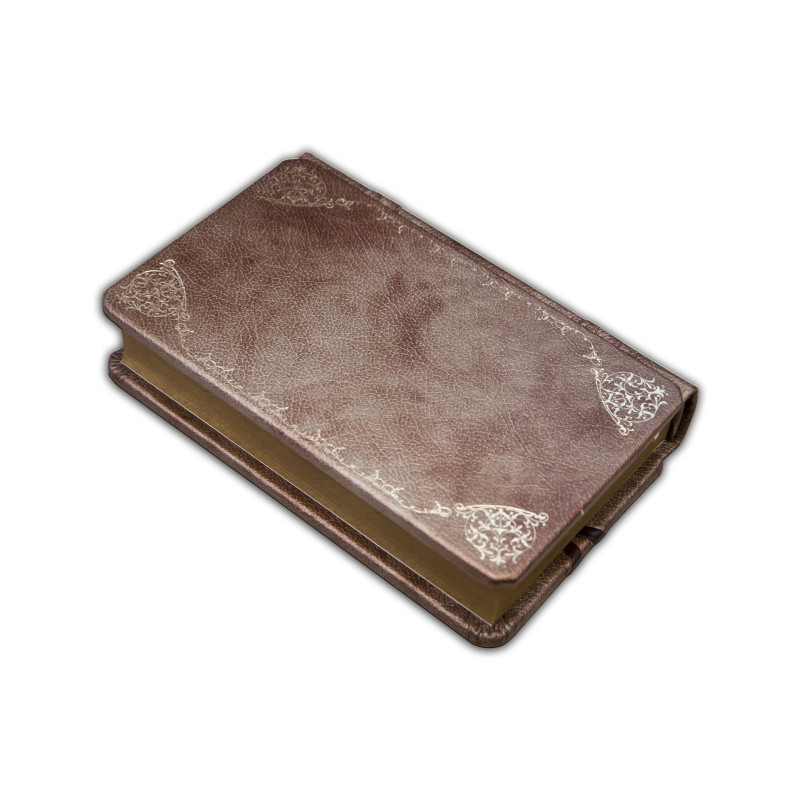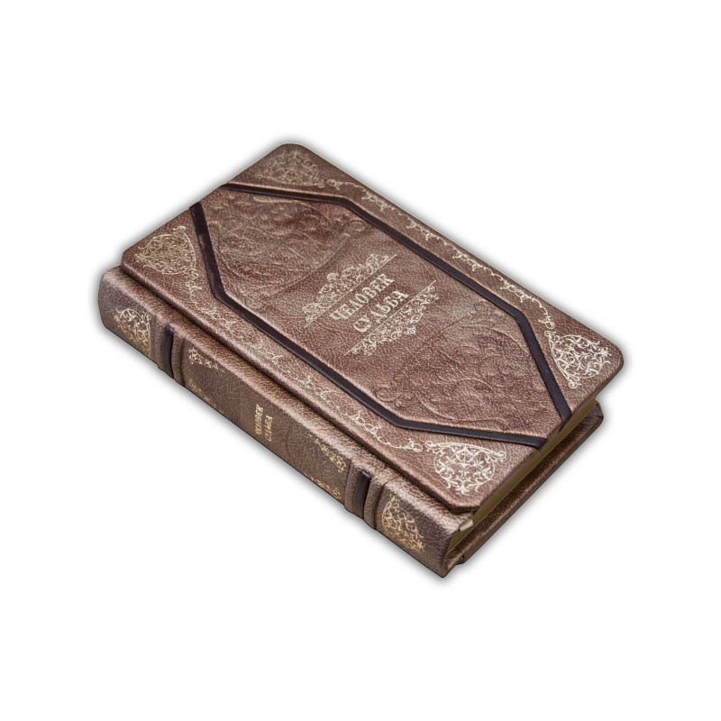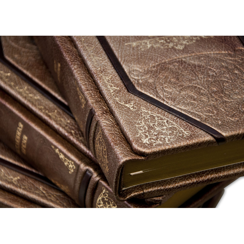 Составной переплет «Брадель», ручной работы, выполнен из комбинации натуральной кожи (кожа «Traboccare», кожа «Grash» производства итальянской кожевенной фабрики «Claudio»). Обложки книг и футляр-ложемент оформлены многоуровневым тиснением, глубоким блинтовым и рельефным золотым, с использованием фольги «Luxor 240». Внутреннее убранство футляра устлано натуральным бархатом «Morbidezza». Обрез книги вручную полирован и позолочен (цвет «Bronze»).
