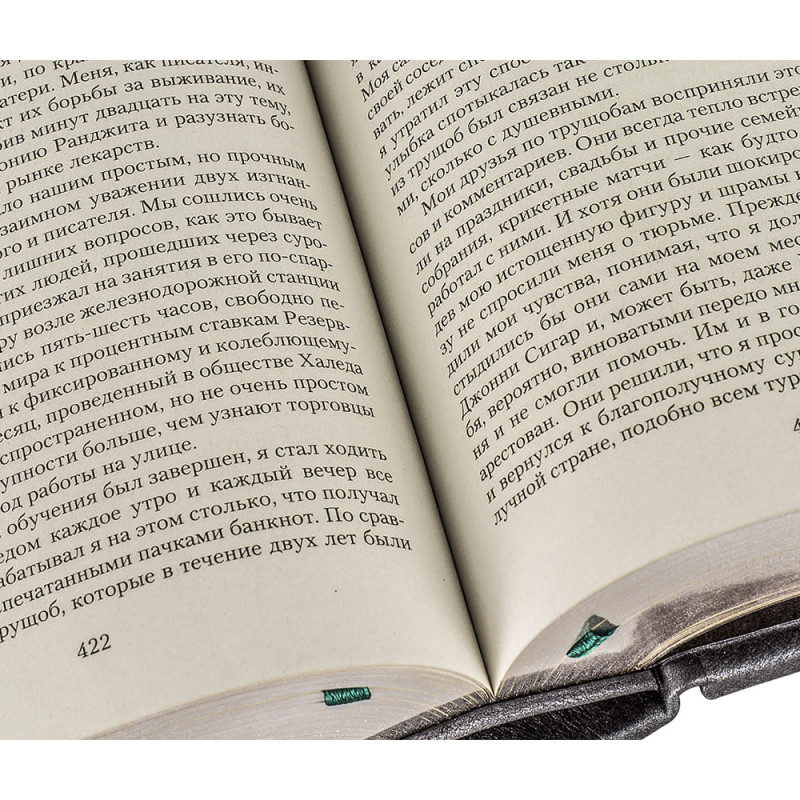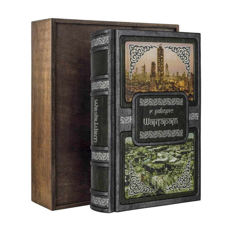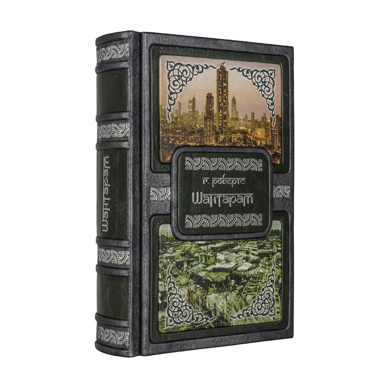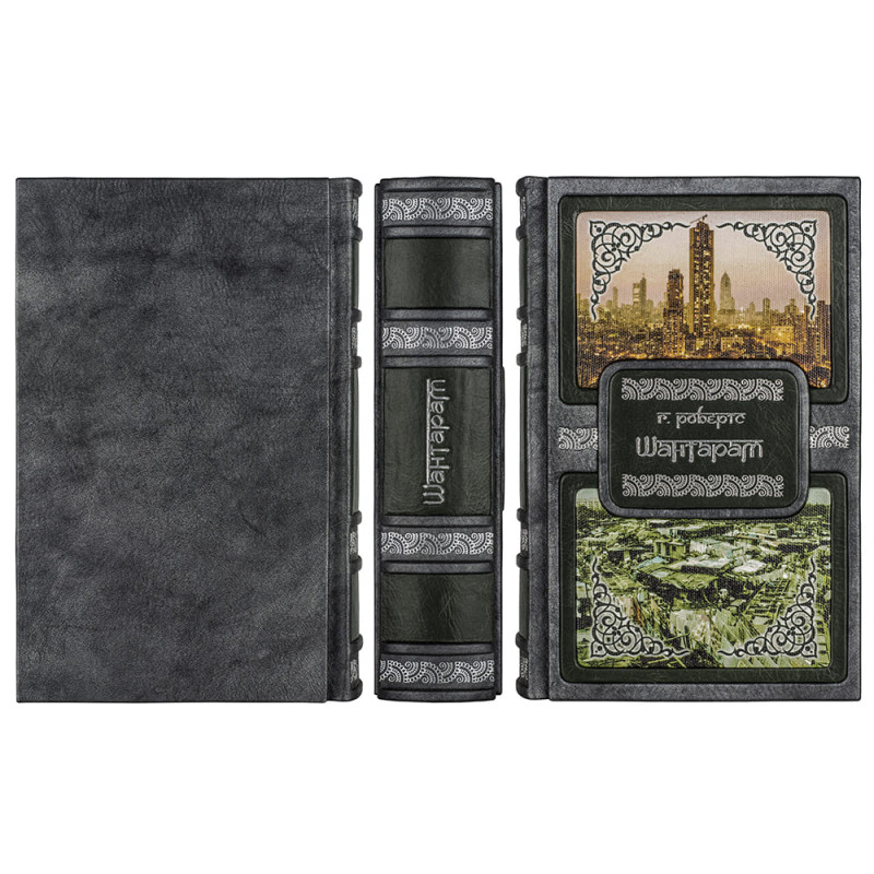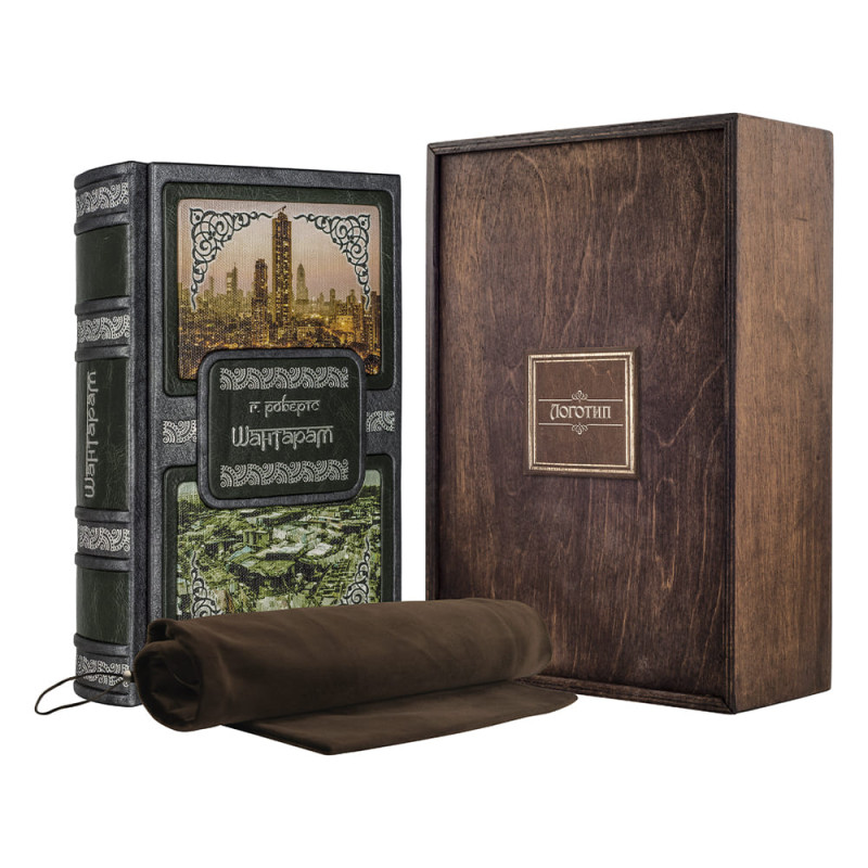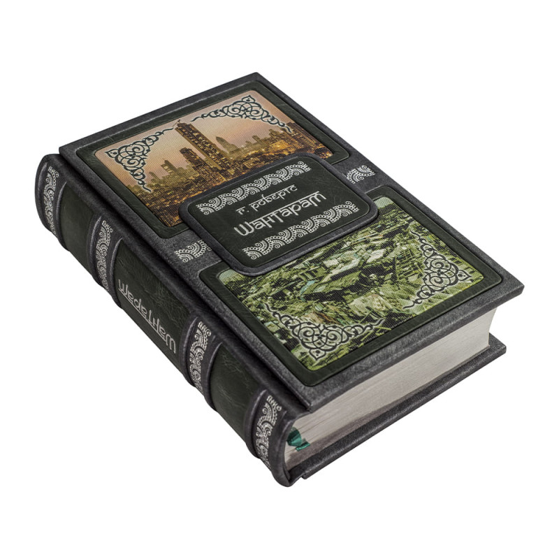Составной переплет "Брадель" ручной работы, выполнен из комбинации натуральных кож (кожа "Gabinetto Green", кожа "Nicko Grigio" производства итальянской кожевенной фабрики "Benericetti"). Обложка книги двухуровневая, декорирована вставками из холста с художественными репродукциями, оформлена рельефным серебряным тиснением. Обрез блока вручную полирован и посеребрен. Персональный сертификат с индивидуальным текстом поздравления. Бархатный мешочек. Деревянная коробка.