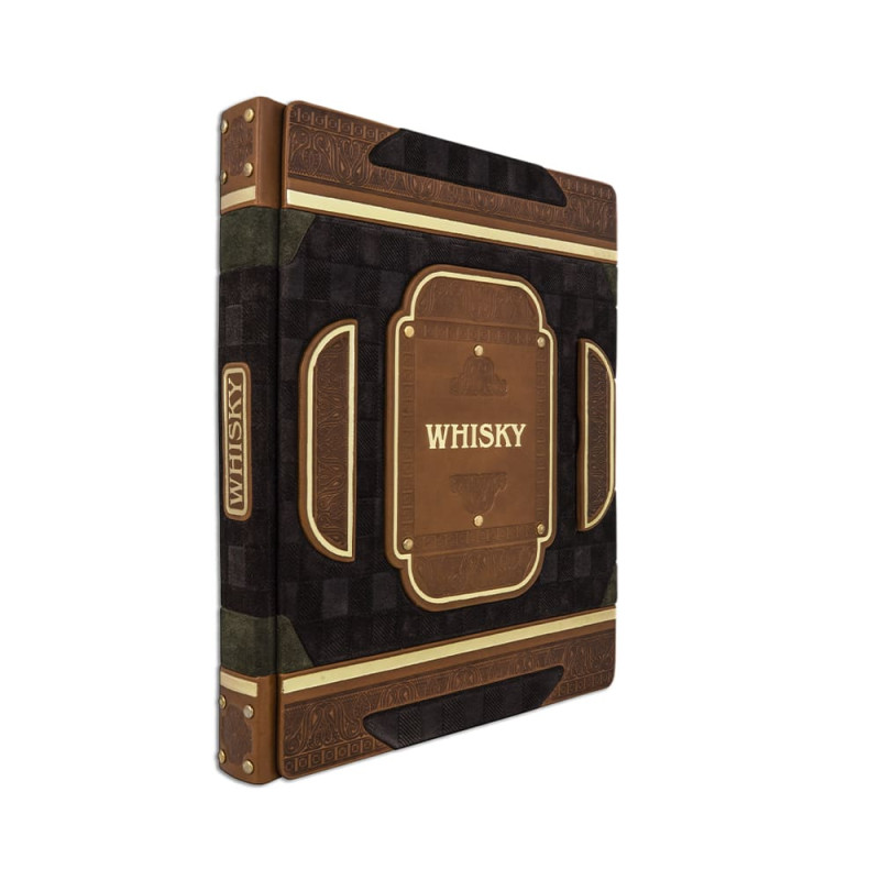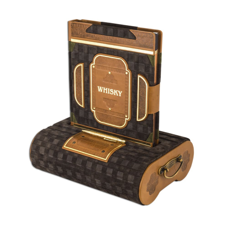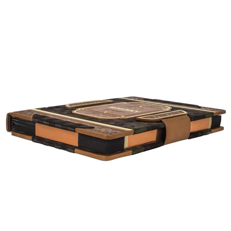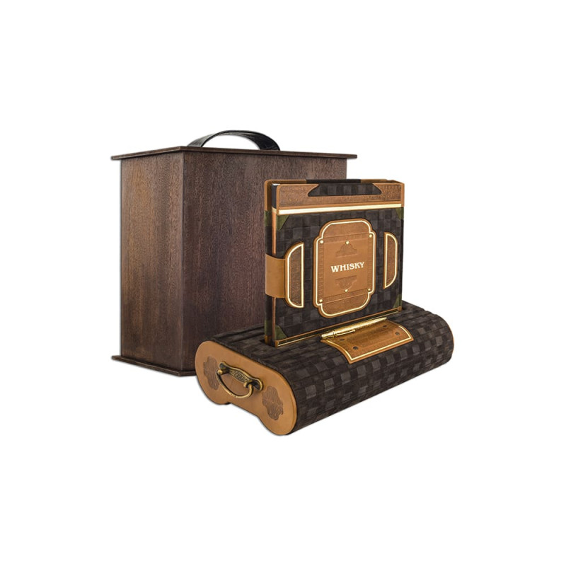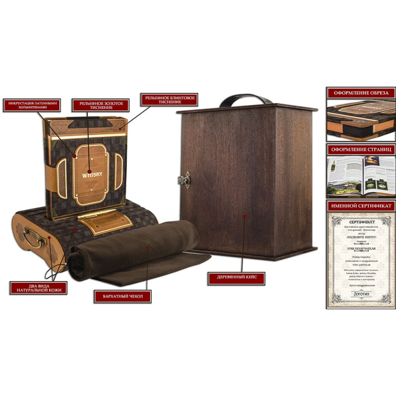 Составной переплет "Брадель" ручной работы, выполнен из комбинации натуральных кож "Robat Maronne", "Gabbia camoscio" и "Troppopieno luminoso" производства итальянской кожевенной фабрики "Benericetti". Обложка книги двухуровневая, декорирована комбинацией глубокого блинтового и рельефного золотого тиснения (использована фольга "Luxor 240"), оформлена позолоченными ножками (4 штуки) и латунными хольнитенами. Обрез блока вручную полирован, окрашен и позолочен сусальным червонным золотом. Подставка авторской конструкции "Бочка" декорирована под стиль книги и внутри устлана итальянским коттон-бархатом.