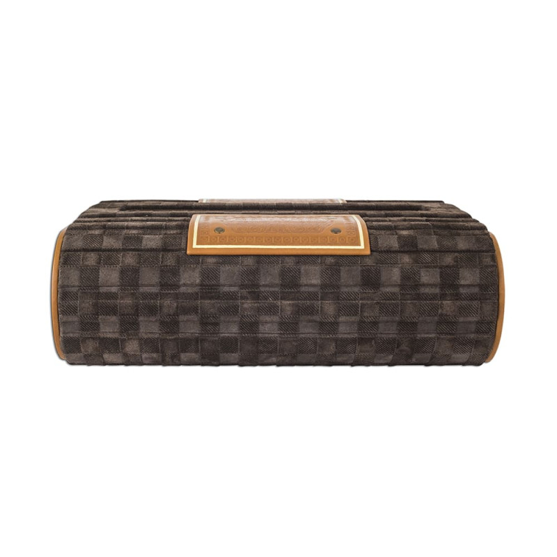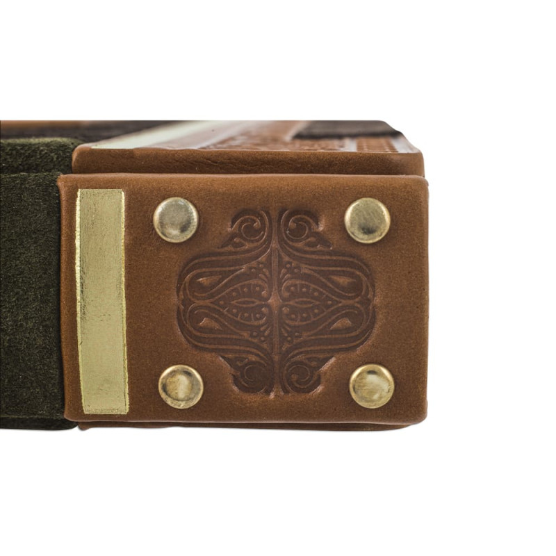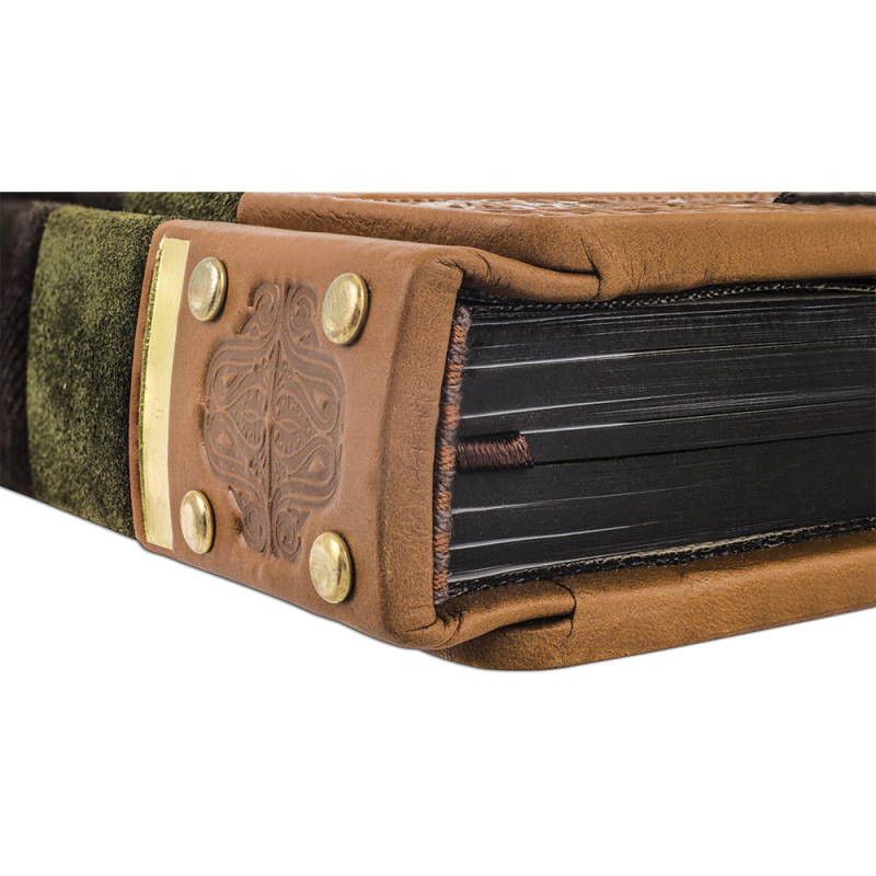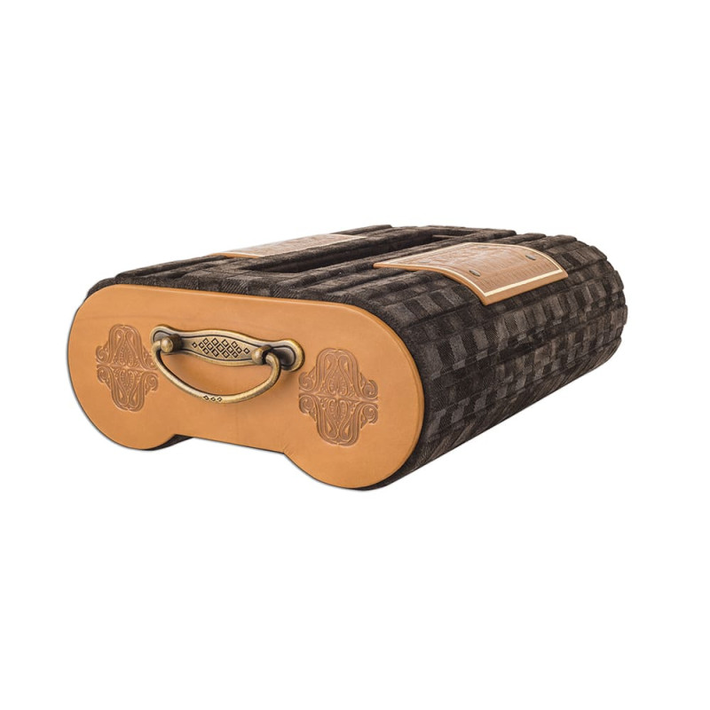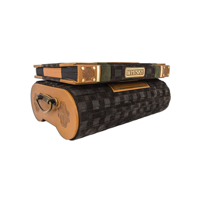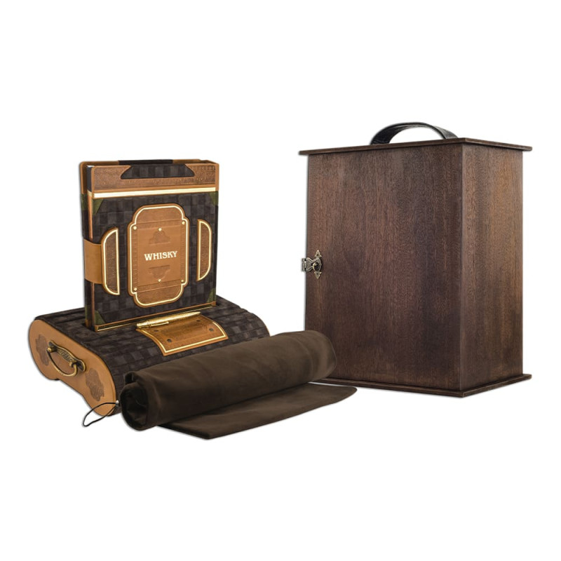 Составной переплет "Брадель" ручной работы, выполнен из комбинации натуральных кож "Robat Maronne", "Gabbia camoscio" и "Troppopieno luminoso" производства итальянской кожевенной фабрики "Benericetti". Обложка книги двухуровневая, декорирована комбинацией глубокого блинтового и рельефного золотого тиснения (использована фольга "Luxor 240"), оформлена позолоченными ножками (4 штуки) и латунными хольнитенами. Обрез блока вручную полирован, окрашен и позолочен сусальным червонным золотом. Подставка авторской конструкции "Бочка" декорирована под стиль книги и внутри устлана итальянским коттон-бархатом.