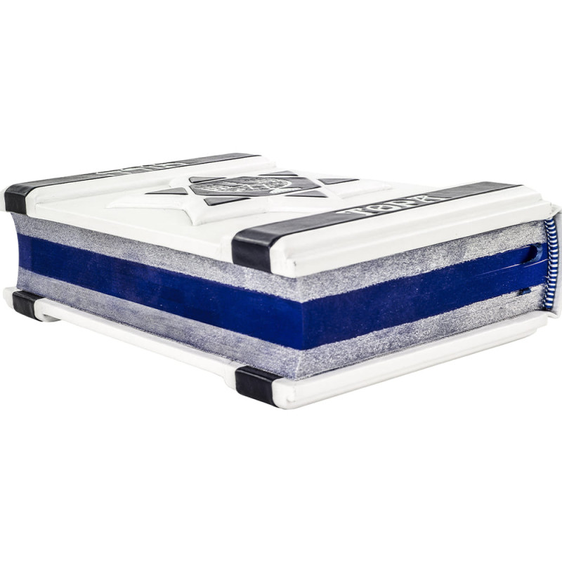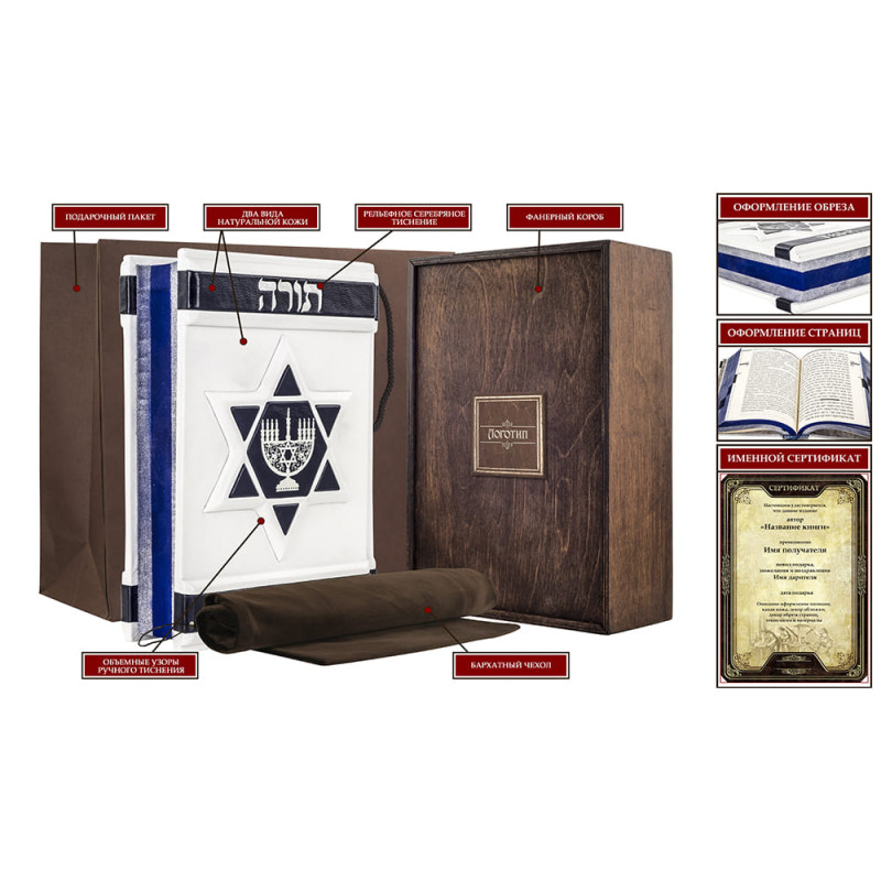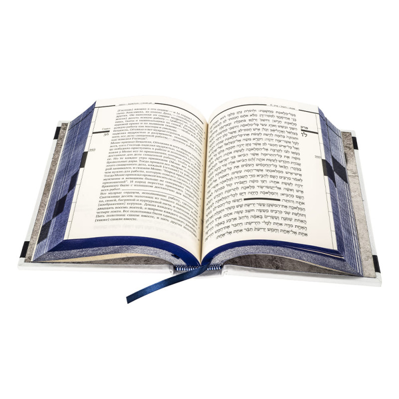 Составной переплет "Брадель", ручной работы, выполнен из комбинации натуральных кож "Parle" и "Marmo blue" производства итальянской кожевенной фабрики "Benericetti". Обложка книги уникальной авторской архитектуры оформлена высоким рельефом, декорирована серебряным тиснением (использована фольга "Luxor 240"). Обрез книги вручную полирован и декорирован комбинацией серебра и синей фольги.