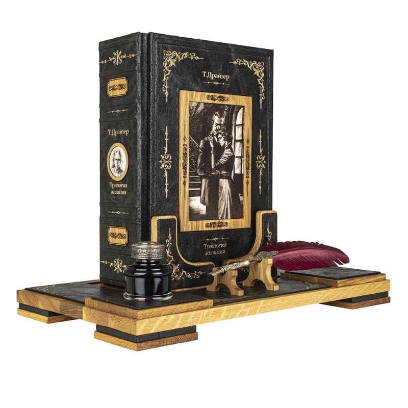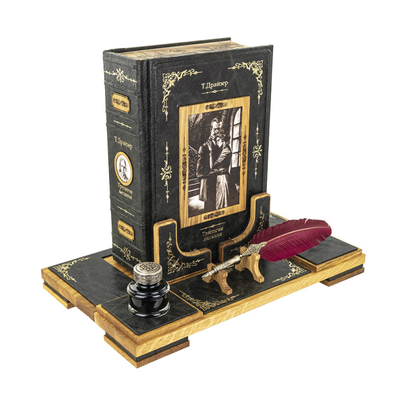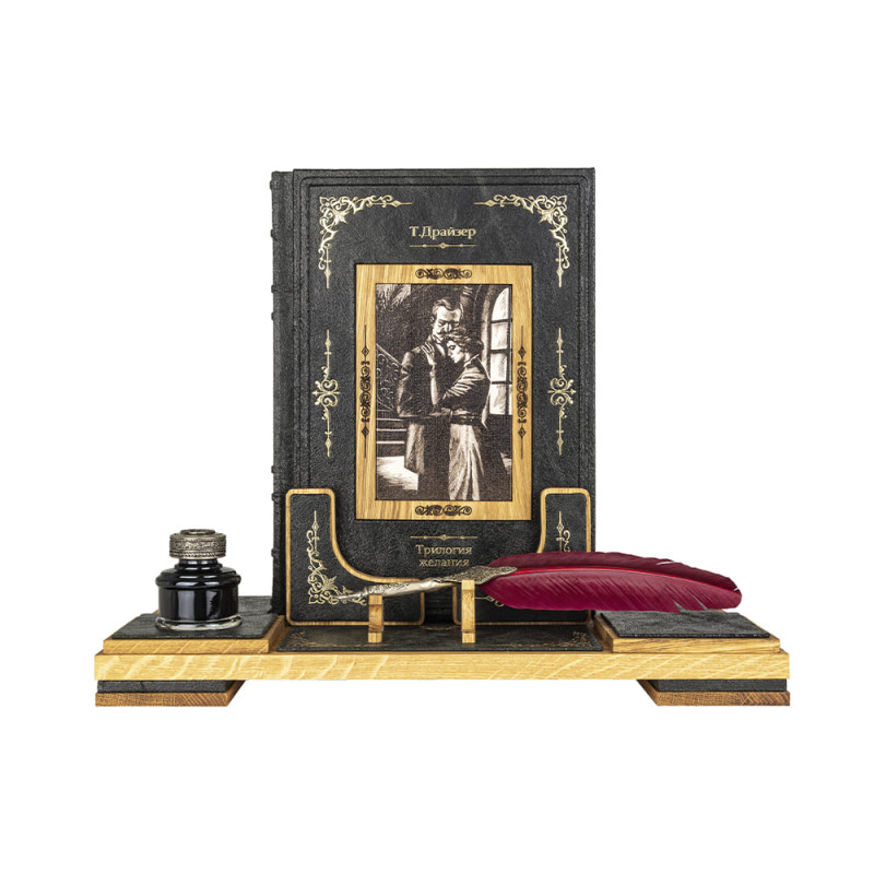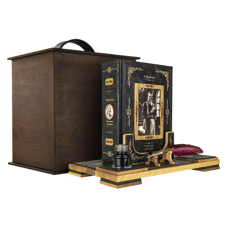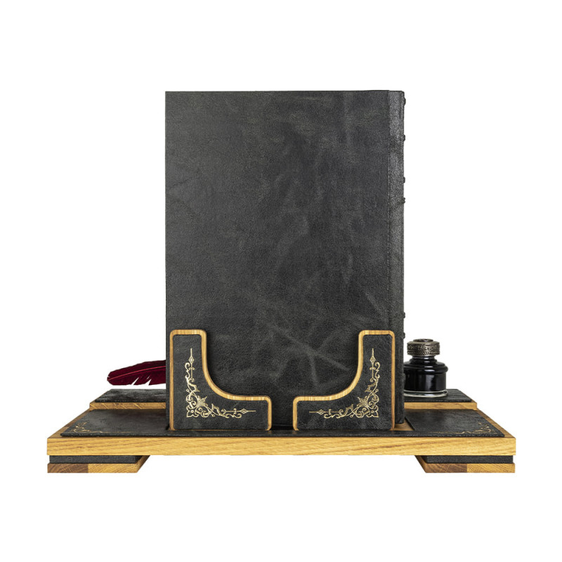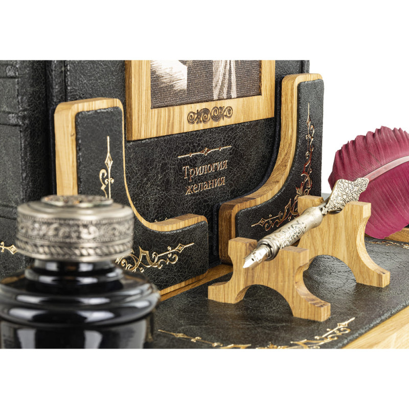 Составной переплет "Брадель" ручной работы, выполнен из натуральной кожи "Crosta Nero" производства итальянской кожевенной фабрики "Carisma". Обложка книги оформлена рельефным золотым тиснением, c использованием фольги "Luxor 240", декорирована вставкой из холста с художественной фотопечатью и накладками из натурального дуба. Обрез книги выполнен в уникальной технике позолоты с нанесением художественной репродукции. Подставка выполнена в том же стиле что и книга, а также декорирована перьевой ручкой и чернильницей.